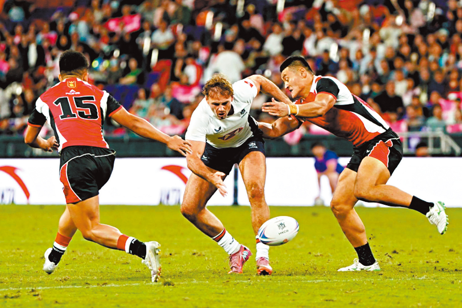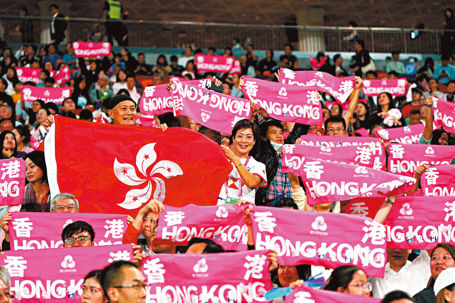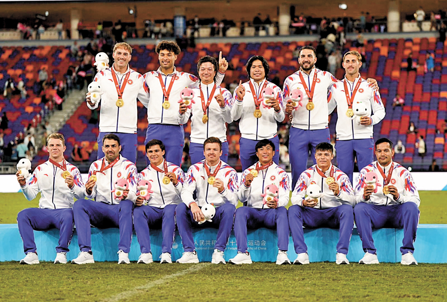 十五運會七人欖球賽決賽,香港男子七人欖球於啟德主場館在過萬名球迷組成的「粉紅旗海」支持下,以26:19擊敗山東隊,拿下球隊史上首面全運金牌,亦助港隊今屆全運會獎牌數目增至四金一銅,再次刷新港隊單屆全運金牌最高紀錄。 ●圖/文:香港文匯報記者 郭正謙