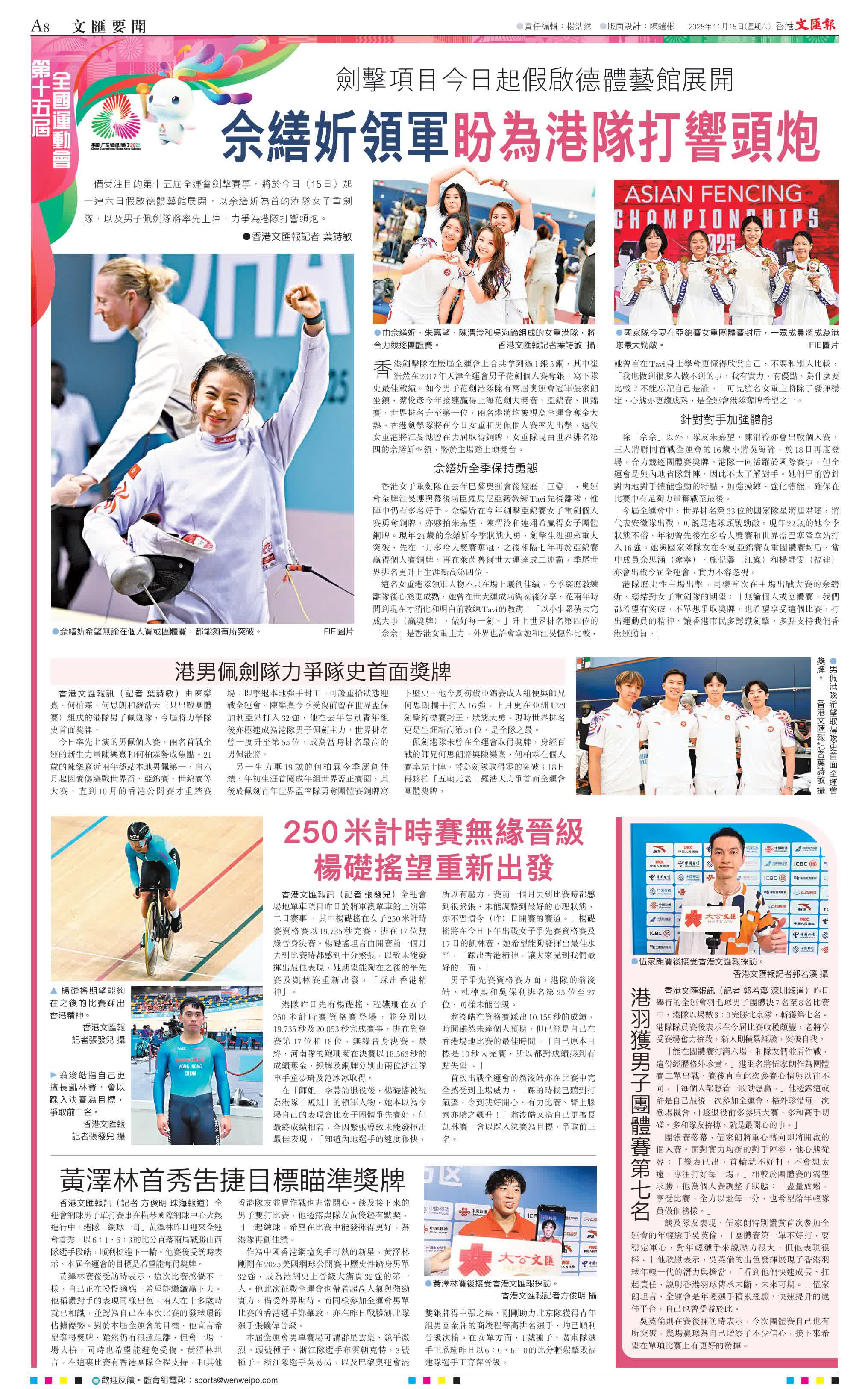 香港女子重劍隊在去年巴黎奧運會後經歷「巨變」,奧運會金牌江旻憓與幕後功臣羅馬尼亞籍教練Tavi先後離隊,惟陣中仍有多名好手。佘繕妡在今年劍擊亞錦賽女子重劍個人賽勇奪銅牌,亦夥拍朱嘉望、陳渭泠和連翊希贏得女子團體銅牌。現年24歲的佘繕妡今季狀態大勇,劍擊生涯迎來重大突破,先在一月多哈大獎賽奪冠,之後相隔七年再於亞錦賽贏得個人賽銅牌,再在萊茵魯爾世大運達成二連霸,季尾世界排名更升上生涯新高第四位。