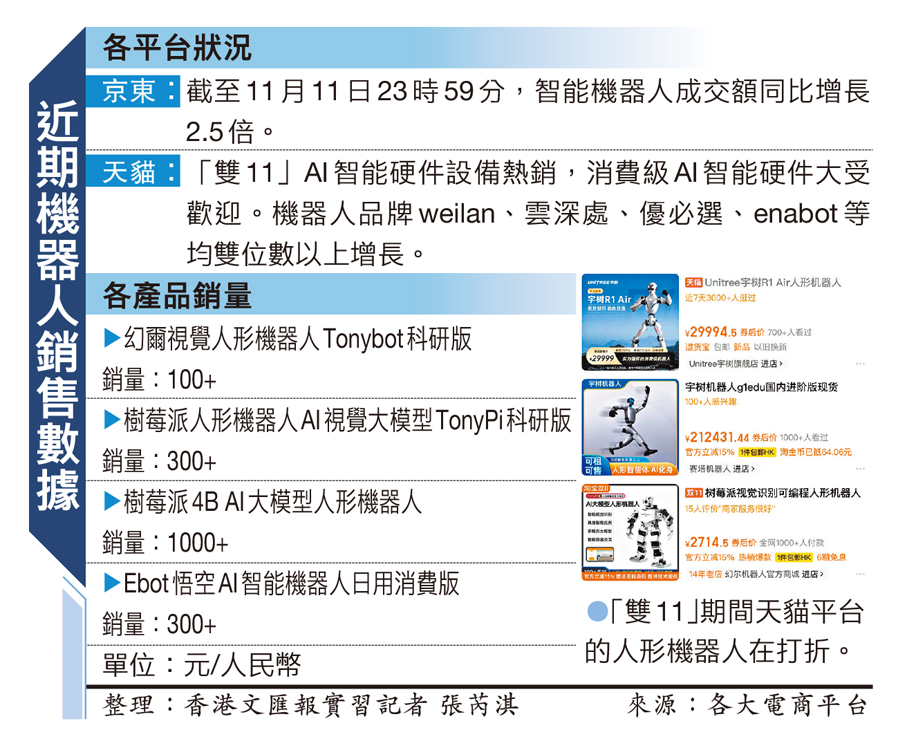 天貓幻爾官方旗艦店告訴香港文匯報記者,「樹莓派人形機器人AI視覺大模型TonyPi」是本次「雙11」期間的爆款,銷量超300件。其定價在2,550元至5,250元,主要用於科研開發、競賽和教學使用。優必選旗艦店對香港文匯報記者表示,其8月份剛剛上新的AI悟空2代智能教育機器人,成為該店「雙11」期間銷量第一的人形機器人。定價僅3,100元,主要用於日常生活陪伴及娛樂。