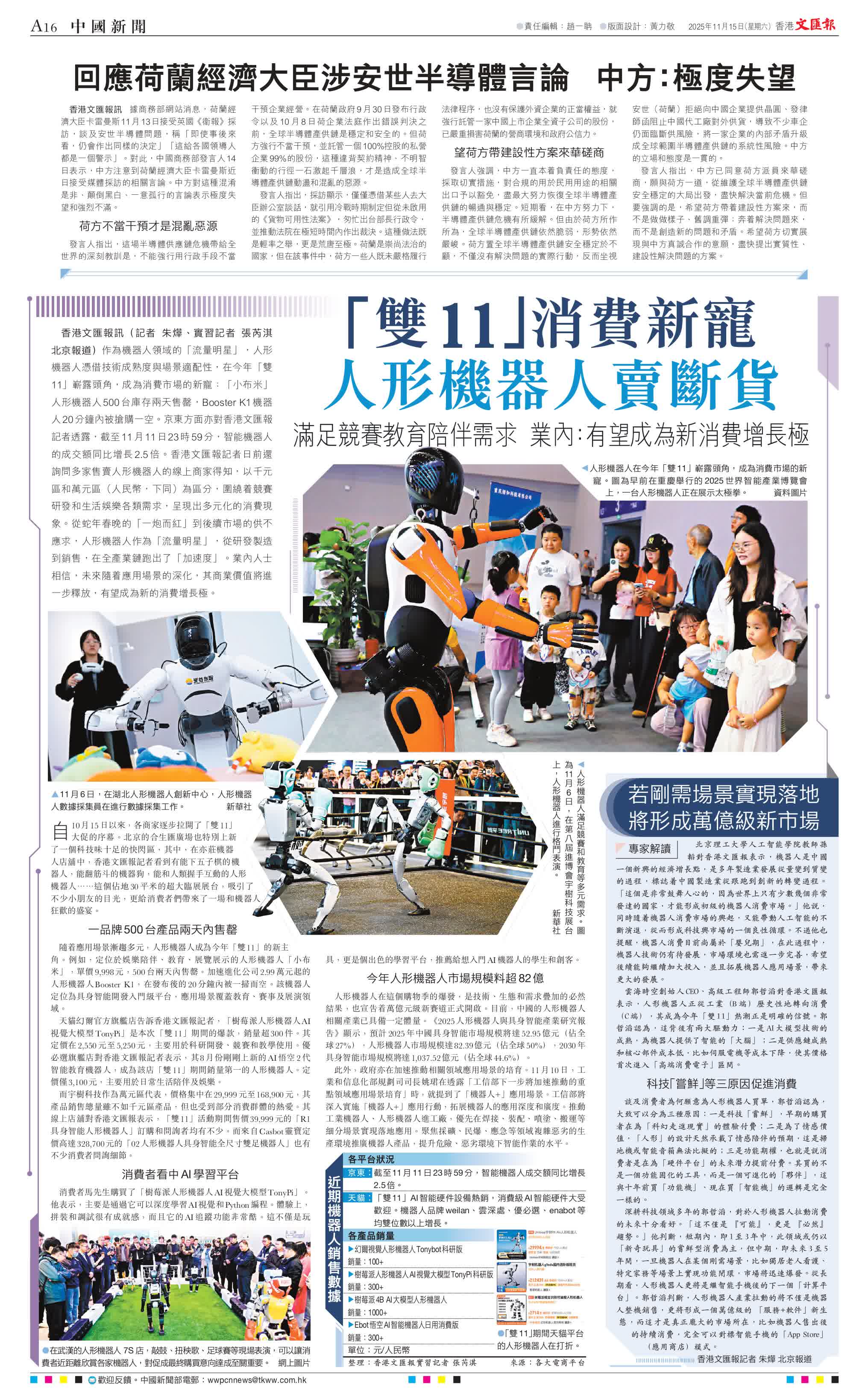 隨着應用場景漸趨多元,人形機器人成為今年「雙11」的新主角。例如,定位於娛樂陪伴、教育、展覽展示的人形機器人「小布米」,單價9,998元,500台兩天內售罄。加速進化公司2.99萬元起的人形機器人Booster K1,在發布後的20分鐘內被一掃而空。該機器人定位為具身智能開發入門級平台,應用場景覆蓋教育、賽事及展演領域。