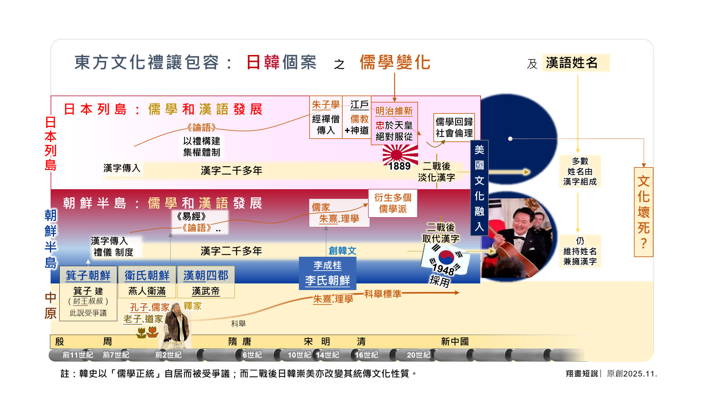 - 近代轉型:日治時期(1910-1945)遭遇「皇道儒學」的植入壓力;二戰後,韓國儒學褪去政治外衣,轉化為社會倫理根基,在漢字使用、節慶習俗中實現現代傳承。
