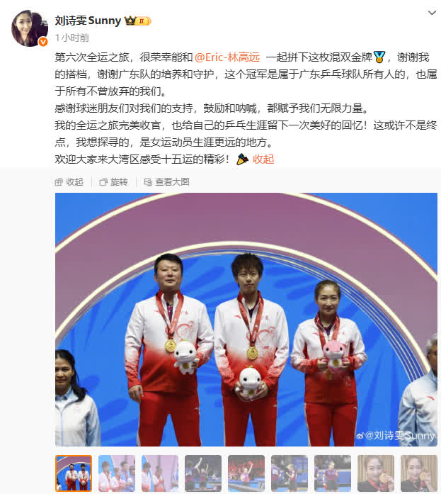 11月14日,在澳門舉行的十五運會乒乓球混雙決賽,廣東隊林高遠/劉詩雯戰勝江蘇隊陳垣宇/蒯曼,奪得金牌。劉詩雯今日(15日)於社媒發文,回顧第六次全運會之旅,並深情感謝球迷們的支持。