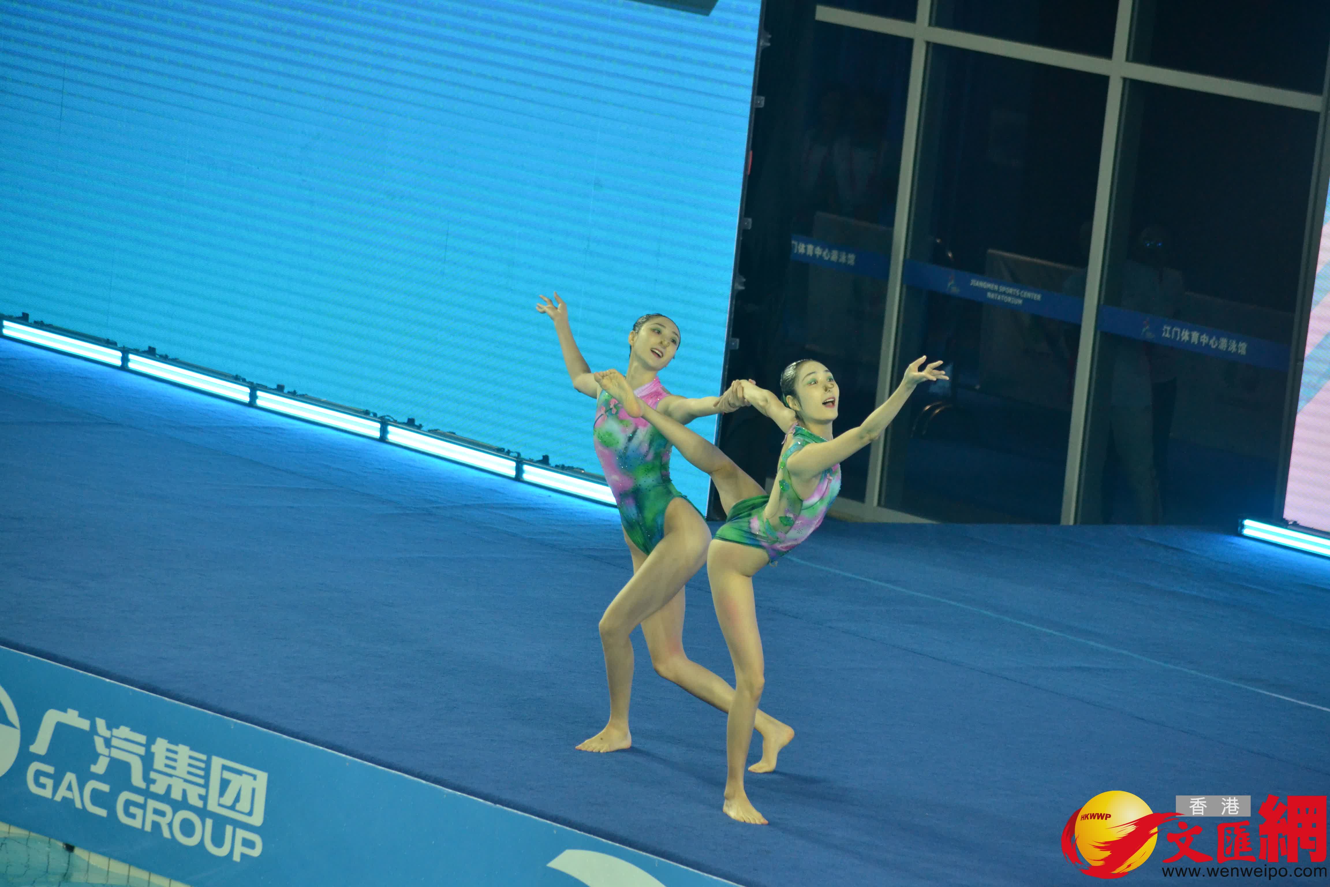 (香港文匯網記者 敖敏輝 江門報道)15日,十五運會花樣游泳女子雙人項目在江門體育中心游泳館開賽。巴黎奧運會集體、雙人項目「雙料冠軍」王柳懿、王芊懿的正式亮相,瞬間引爆現場氛圍。比賽現場看到,她們的服裝色彩搭配十分驚艷,漂亮又大方,展現東方韻味同時又不失時尚魅力。她們的技術動作的優美和協調性,打動了觀眾,更得到評委的認可。最終,壓軸出場的姐妹倆,獲得299.0726分,一舉超越此前領跑的北京隊,強勢奪得榜首位置。