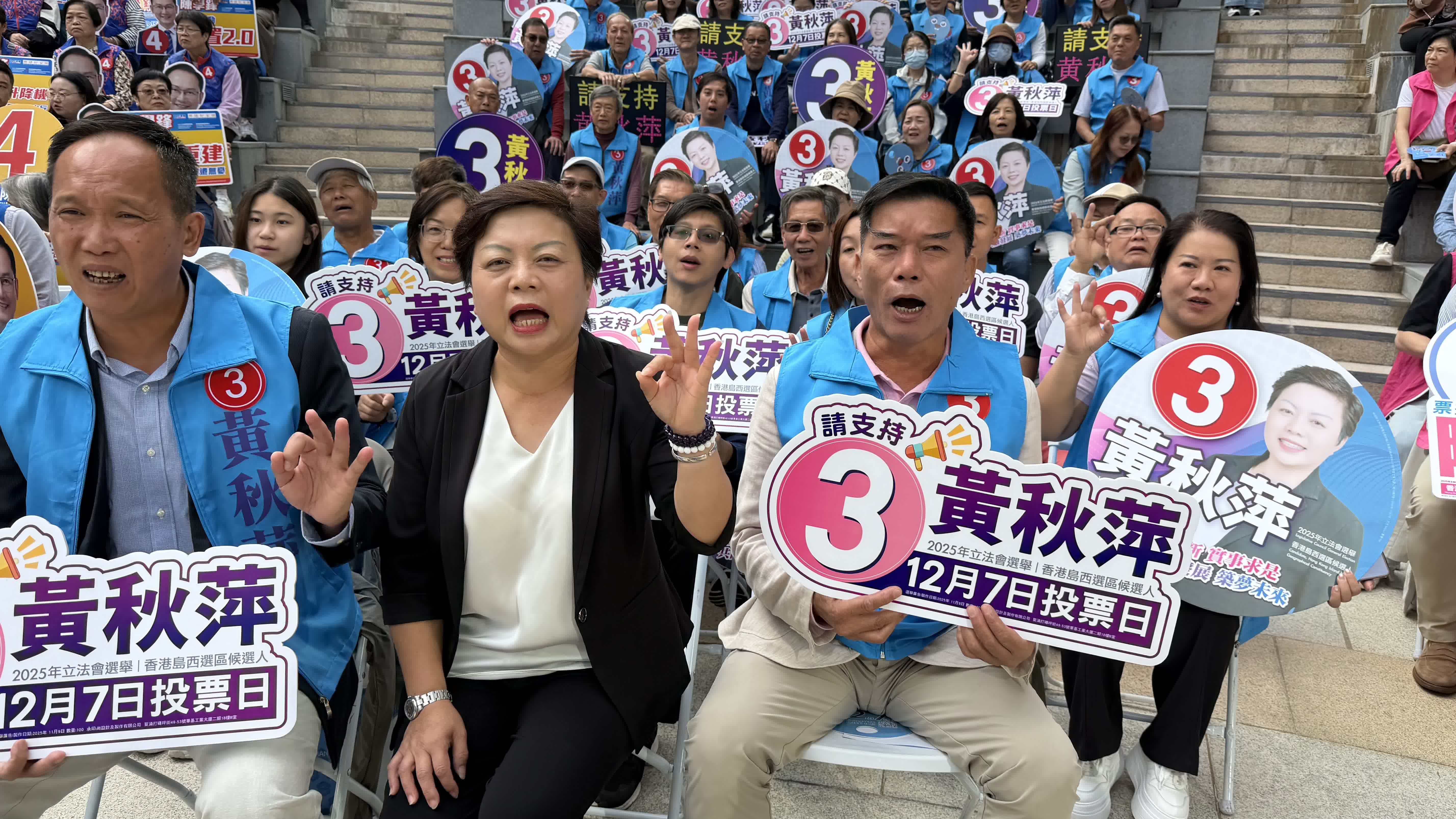 3號候選人離島區議員黃秋萍,報稱無政治聯繫。她表示,過去6年感謝大家支持,自從擔任離島區議會交通運輸委員會主席,更了解區內民生需求,致力解決單車泊位難、交通堵塞等痛點,為市民做實事。黃秋萍介紹自己的參政理念,包括完善交通基建,爭取興建大嶼山環島公路,關注南港島綫西段進度,爭取重推租置計劃,並致力保障婦女權益,如爭取將三八婦女節納入香港法定假日等。