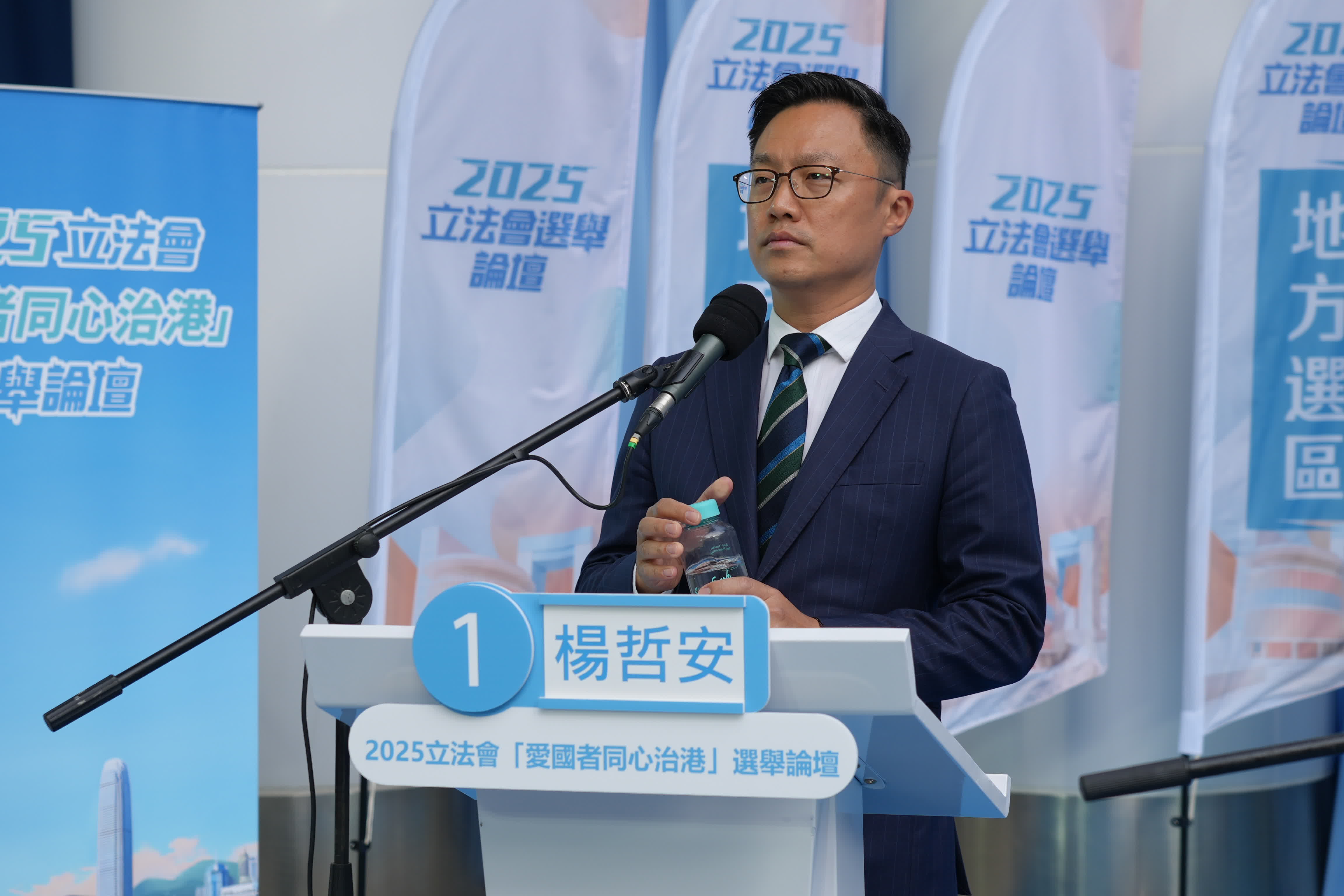 1號候選人中西區議員、自由黨成員楊哲安曾任教育局政治助理,他指自己在當區成長,十分熟悉當區情況,亦是當區唯一一位有政商及地區經驗的候選人。他的參選理念為「求變」與「希望」:第一,香港要變,先決條件即議會要變,自己會給更多「橋」予政府,提供香港向上流動的空間;第二,給香港更多希望,過往投票率低,今屆自己參選,希望給沉默的大多數一個機會。