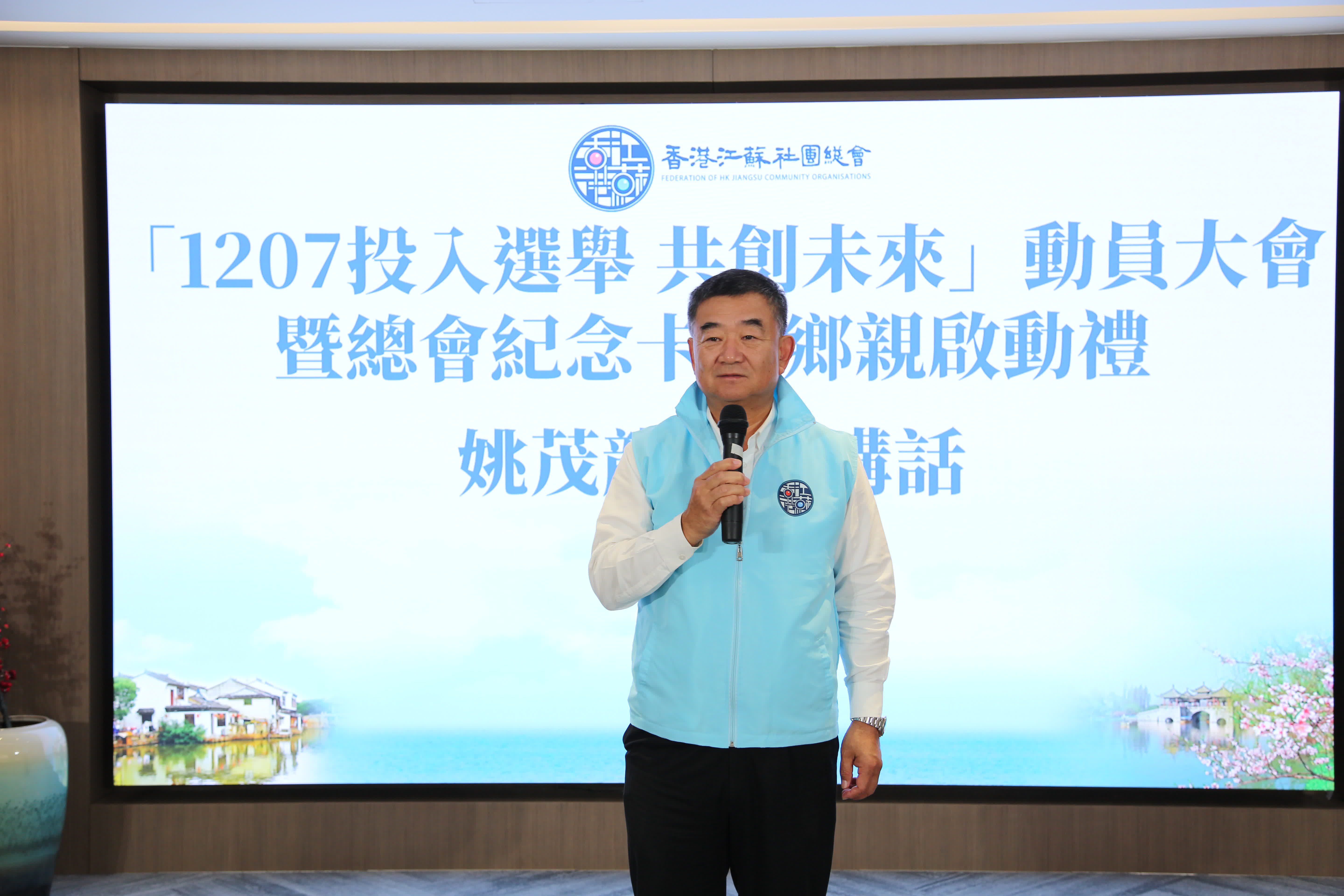 姚會長首先感謝唐會長百忙之中組織召開1207動員大會,給大家加油鼓勁,並再次呼籲大家12月7日踴躍投票,盡公民責任。緊接着,他宣布啟動總會紀念卡贈鄉親活動。此款紀念卡設計上充滿江南水鄉韻味,極具江蘇特色,紀念卡的推出旨在通過鄉情聯結,以更有力度、更精準、更實在的形式鼓勵廣大會員、旅港江蘇鄉親及親友積極參與投票,貢獻力量。最後,他強調,總會作為愛國愛港的重要力量,必將全力支持本屆立法會選舉,希望大家積極行動起來,盡己之責,帶動身邊的親朋好友共同參與,匯聚力量,攜手為香港開創更美好的明天。
