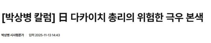 《亞洲經濟》表示,高市首相的囂張行徑,不僅針對韓國,也針對中國,絕不能對其掉以輕心。或許有人會批評她輕浮無知,但絕不能忽視隱藏在高市首相背後的日本極右勢力的真面目。高市正是他們的象徵,這使她變得更加危險。