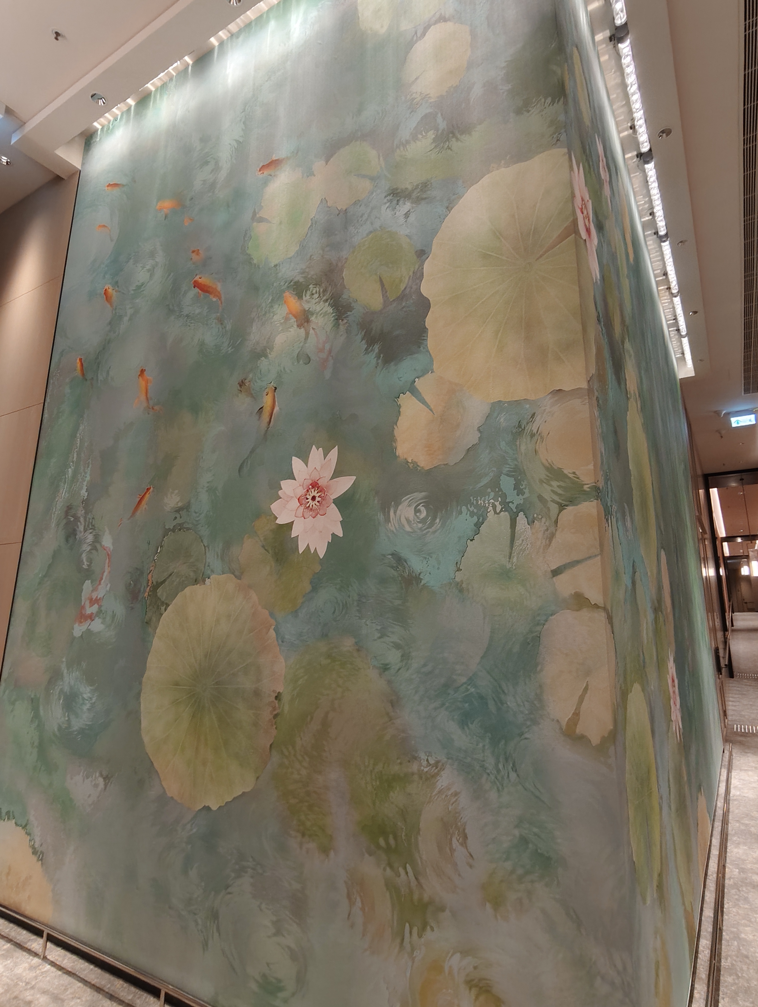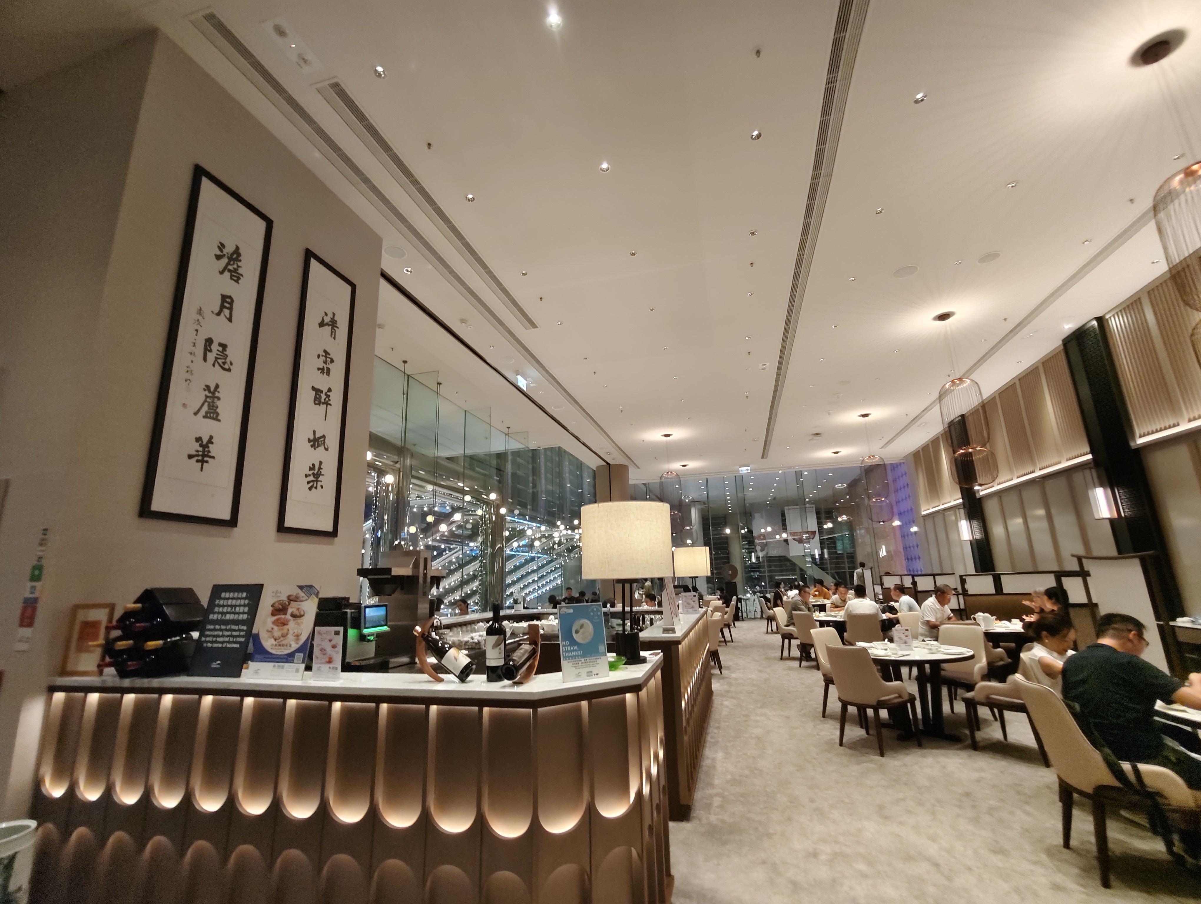 餐廳全新設計以溫暖的中性色系為主,結合中式及現代設計元素,營造出舒適優雅的用餐環境。餐廳內的落地玻璃將自然光引入主用餐區,食客可俯瞰會展中心絡繹不絕的人流及迷人的維港景色,享受既寧靜亦充滿活力的用餐體驗。主餐區另一大亮點是以荷花池為主題的特色牆,將大自然巧妙融入當代設計,讓食客仿如置身於荷亭湖泊,增添恬靜及悠閒的用膳氛圍。