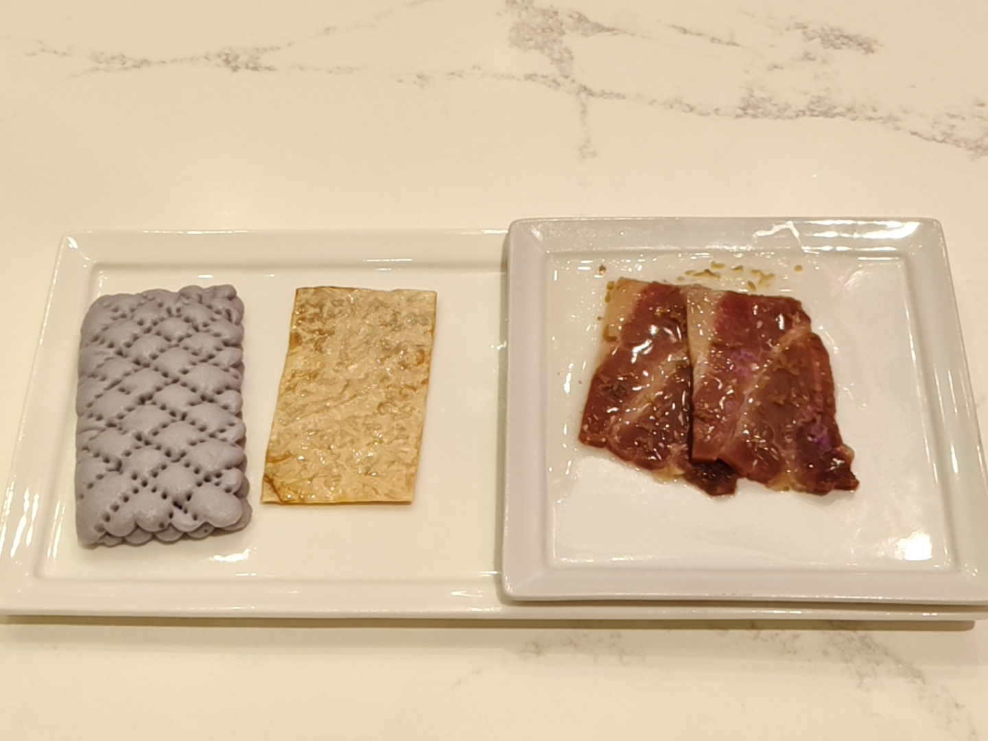 「廚頌」當中的紫圖蜜汁火方是浙江名菜,其獨有的菱格圖案是菜式的標誌,吳師傅特別於這道傳統菜式上作出變奏,把原來雪白的饅頭加入紫薯汁,呈現浪漫粉紫色,再配上香氣濃郁的雲南宣威火腿、來自本地生產的蜜糖加上桂花,以及即叫即烘的香脆腐皮一同品嘗。
