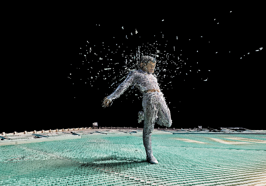 「我們還運用了攝影測量法,讓每位舞者保持特定姿態,通過多角度拍攝數百張照片,最終構建出數字化模型。」那些如科幻電影中所出現的「粒子」人體便由此產生,以像蝶蛹般的鏤空形態流動在空間中,觀眾甚至可以穿過這些聚散的粒子流。