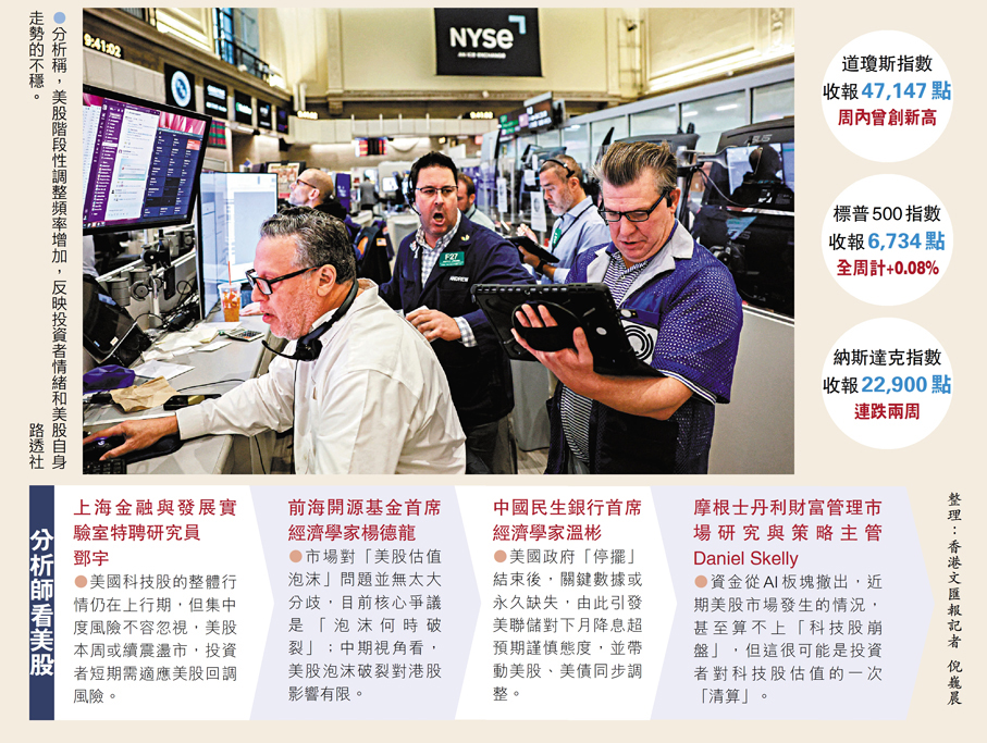 市場對科技股高估值的憂慮,及部分美聯儲官員的「放鷹」,加劇美股震盪。隔夜標指、道指分別收跌0.05%和0.65%,惟納指收漲0.13%,終結日線「兩連跌」。全周看,標指微升0.08%,道指累升0.34%且周內一度刷新歷史新高,而以科技股為主的納指周跌0.45%,連跌兩周。華爾街分析師指,美股市場正經歷整固,現時技術面較此前數周更健康,科技股的動盪不過是科技、AI(人工智能)板塊內部的分化,而非趨勢性掉頭向下。分析稱,美股階段性調整頻率增加,反映投資者情緒和美股自身走勢的不穩,儘管科技板塊增長前景依然廣闊,但短期仍須防範可能的回調風險。 ●香港文匯報記者 倪巍晨 上海報道