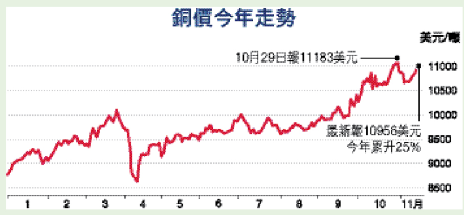 國際金價與銀價於年內屢創新高外,銅的廣泛應用和對經濟的重要性,使其享有「工業之母」的美譽, 因此近期亦有不少資金投資銅這種金屬,令倫敦金屬交易所(LME)銅期貨價格於10月底突破每噸11,100美元,創下歷史新高,與年初價格相比,升幅逾20%。那麼在香港投資者可以如何投資銅?本專題將介紹多種投資銅的途徑。●香港文匯報記者 岑健樂