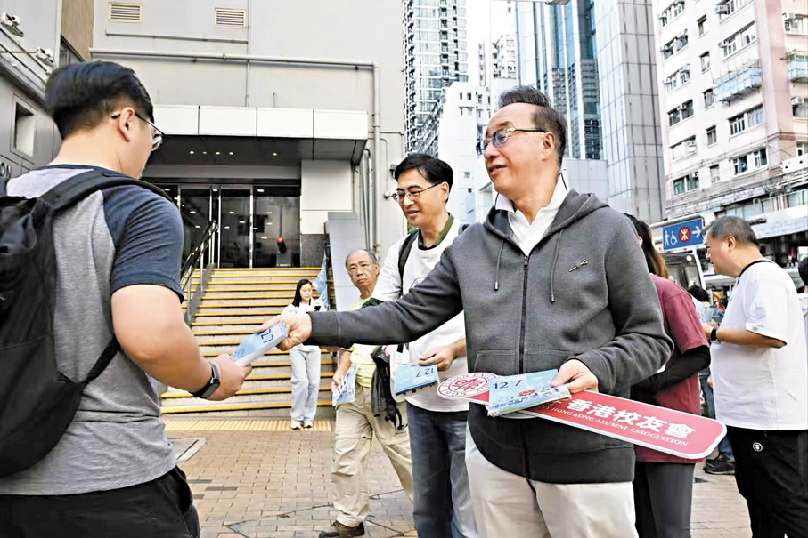 復旦大學香港校友會會長屠海鳴及校友會骨幹昨日在西環德輔道西的西區警署門口,與香港中西區的民政事務處官員和眾多夥伴,派發「12·7」香港第八屆立法會選舉單張,呼籲為香港發展經濟、提升民生,踴躍投下神聖的一票。