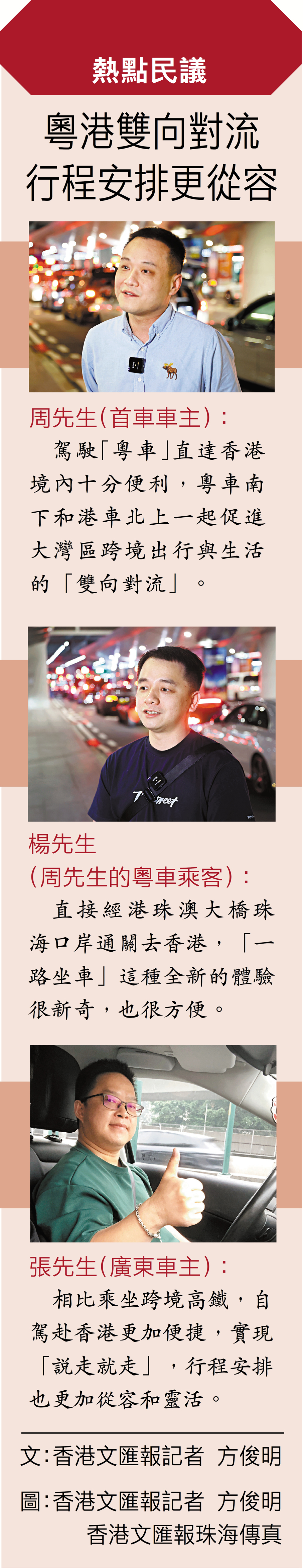湖南車主周先生表示經常自駕遊,每到深圳或珠海時也期待能駕車到香港,希望待粵車南下運作順利後,考慮市場需求與香港承載力,逐步擴展至廣東省以外區域,並直言這類旅客更傾向於留港過夜,有助激發香港消費活力。