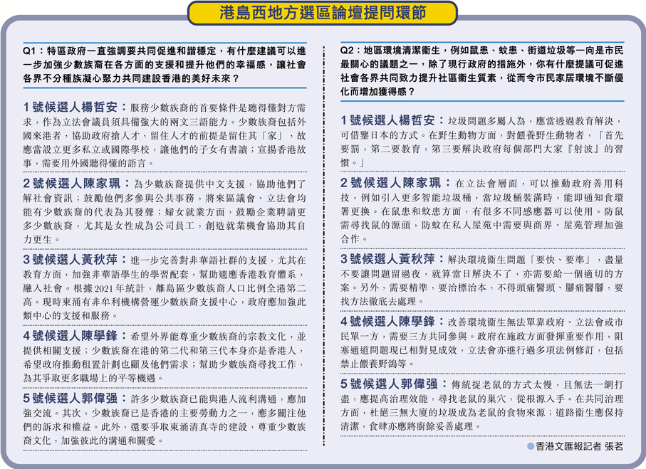 (大公文匯全媒體記者 張茗、陸九如)港島西擁有美麗島嶼、海景和漁民文化,如何發展海島和海濱成為市民關注的議題。於昨日舉行的立法會港島西地方選區論壇中,5位候選人:自由黨楊哲安、新民黨陳家珮、無申報政治聯繫的黃秋萍、民建聯陳學鋒和工聯會郭偉强於辯論環節上,就「關於推進海濱發展,應如何在海港保護、旅遊經濟發展、民生需要等取得平衡,有什麼具體主張和措施」發表意見。其間,身兼中西區區議員的4號陳學鋒和聲稱在當區成長的1號楊哲安「你來我往」,擦出火花,良性互動。