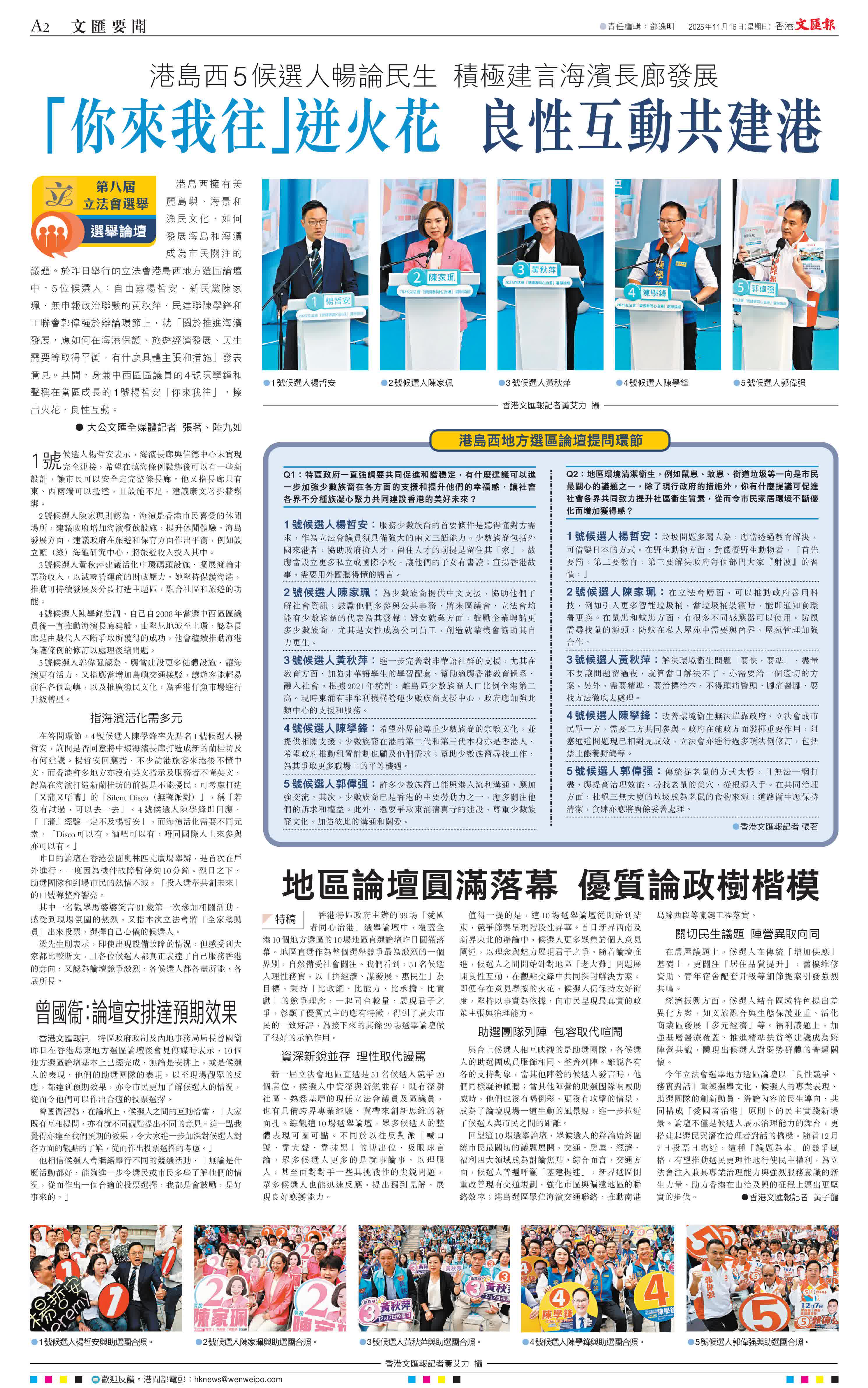 5號候選人郭偉强認為,應當建設更多健體設施,讓海濱更有活力,又指應當增加島嶼交通接駁,讓遊客能輕易前往各個島嶼,以及推廣漁民文化,為香港仔魚市場進行升級轉型。