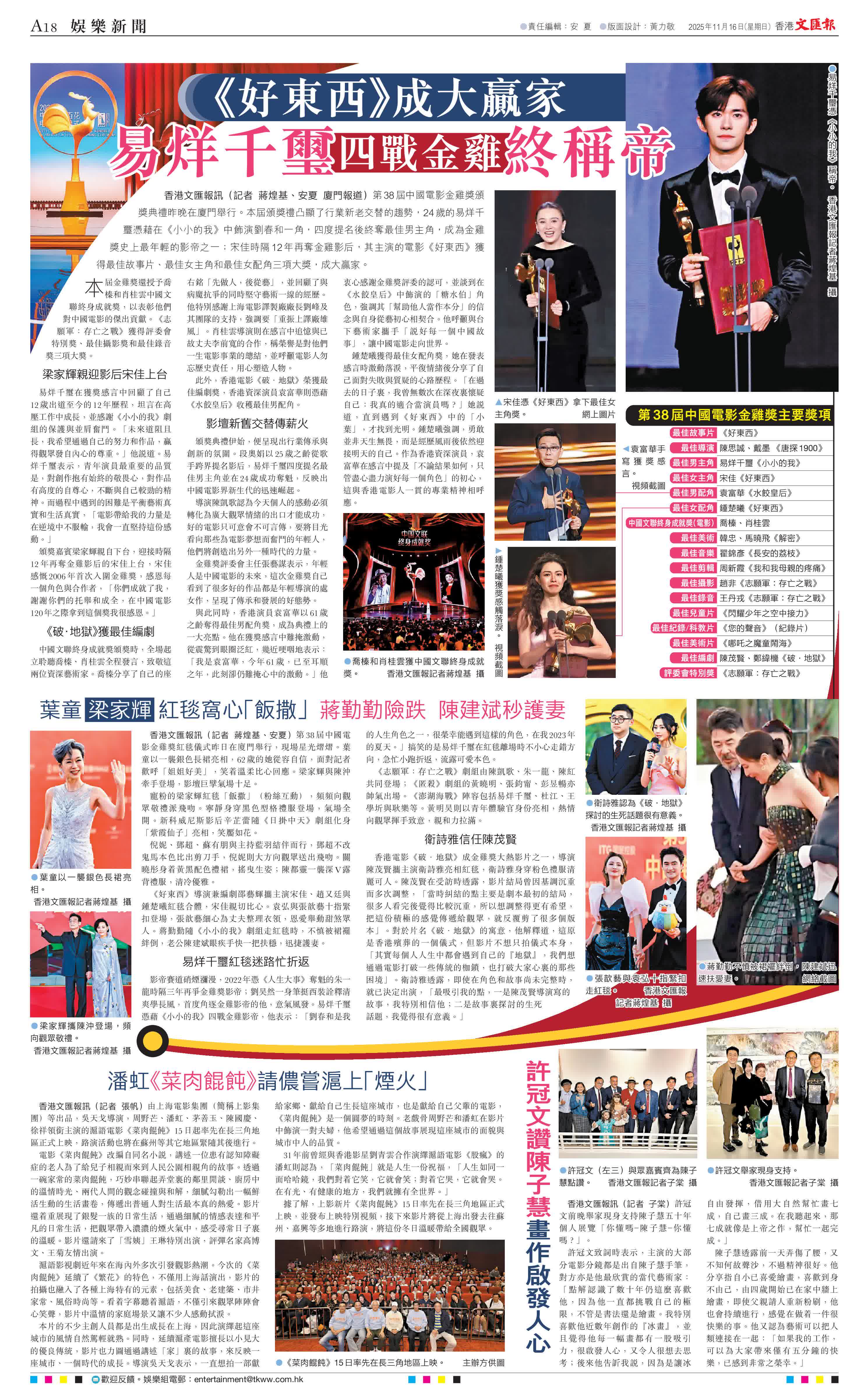 香港文匯報訊(記者 蔣煌基、安夏 廈門報道)第38屆中國電影金雞獎頒獎典禮昨晚在廈門舉行。本屆頒獎禮凸顯了行業新老交替的趨勢,24歲的易烊千璽憑藉在《小小的我》中飾演劉春和一角,四度提名後終奪最佳男主角,成為金雞獎史上最年輕的影帝之一;宋佳時隔12年再奪金雞影后,其主演的電影《好東西》獲得最佳故事片、最佳女主角和最佳女配角三項大獎,成大贏家。
