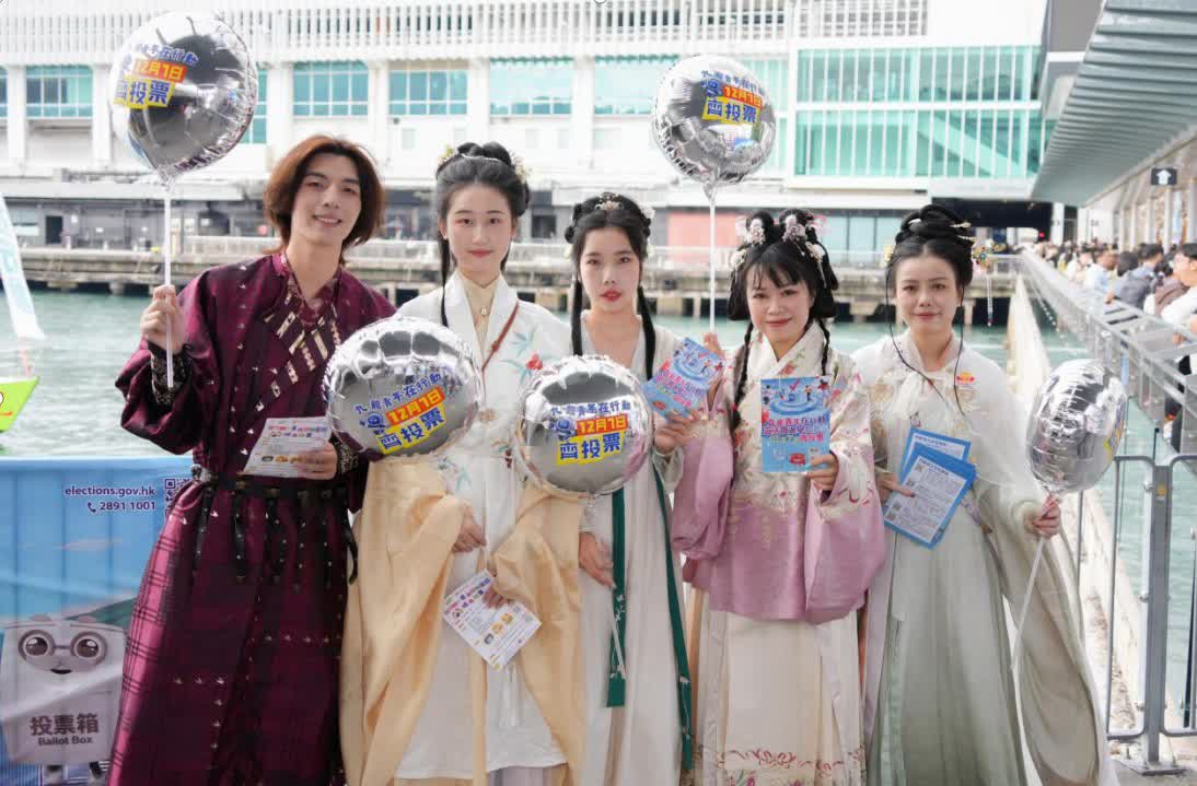身穿漢服青年義工積極向市民講解立法會選舉投票的重要性。他們一邊派發傳單,一邊送上印有投票主題的精美鑰匙扣和氣球,並熱情呼籲市民當天踴躍投票。活動吸引不少市民駐足交流。