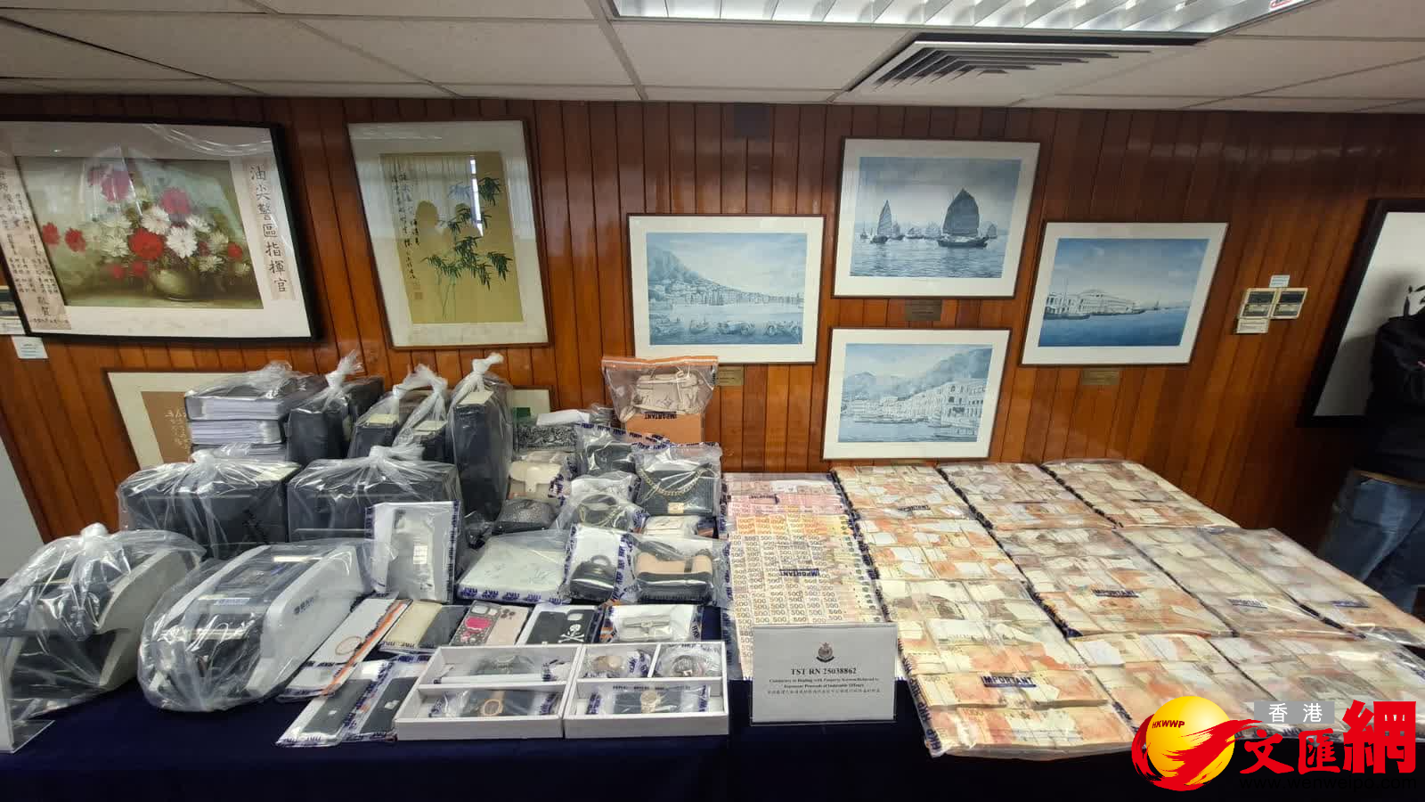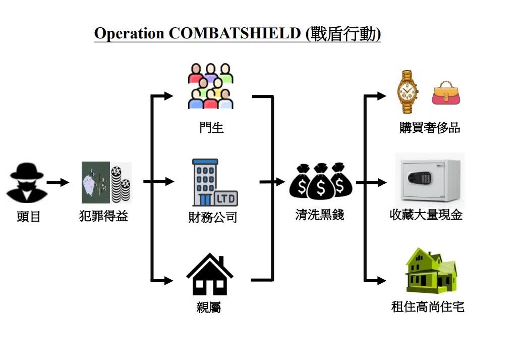 上周四(13日),警方展開代號「戰盾」(COMBATSHIELD)拘捕行動,探員持法庭搜查令,突擊搜查九龍及新界多個地點,當中包括上述的財務公司,同時又搗破由同一個黑社會操控的非法賭檔,並以涉嫌「洗黑錢」、「串謀洗黑錢」、「經營賭博場所」、「在賭博場所內賭博」等罪,拘捕了10男5女,年齡介乎27至62歲,其中一名被捕的35歲本地男子,為該洗黑錢集團的主腦。行動中,人員單在該主腦位於馬鞍山的私人住宅內,檢獲1600萬港元現金,以及5隻總值約700萬港元的名錶。整個行動檢獲的證物總值超過2470萬,包括現金,名貴手錶、首飾、手袋、外幣及大量銀行文件等,並凍結其中3名被捕人銀行戶口內160萬港元存款。