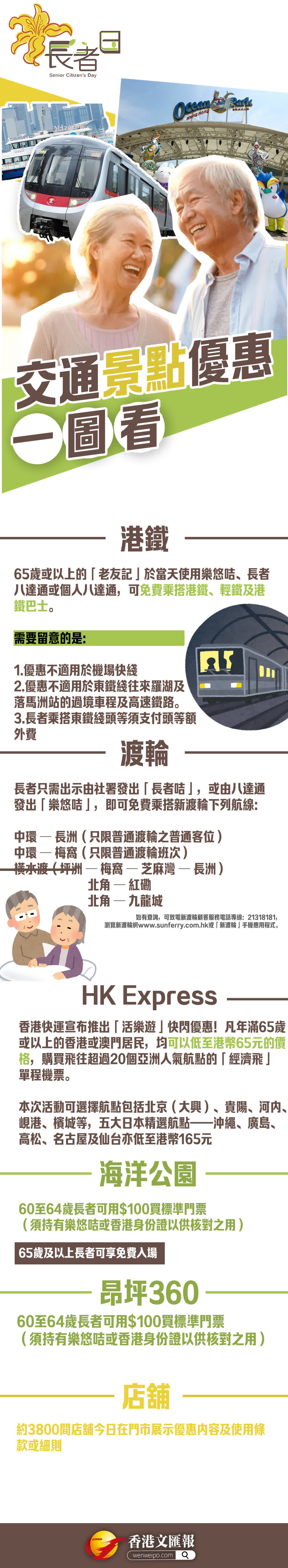 今日(11月16日)是一年一度長者日,全港餐飲、零售、交通、景點等均為65歲及以上長者推出各類優惠活動。「老友記」們只需憑長者咭或樂悠咭即可輕鬆享用各類折扣!