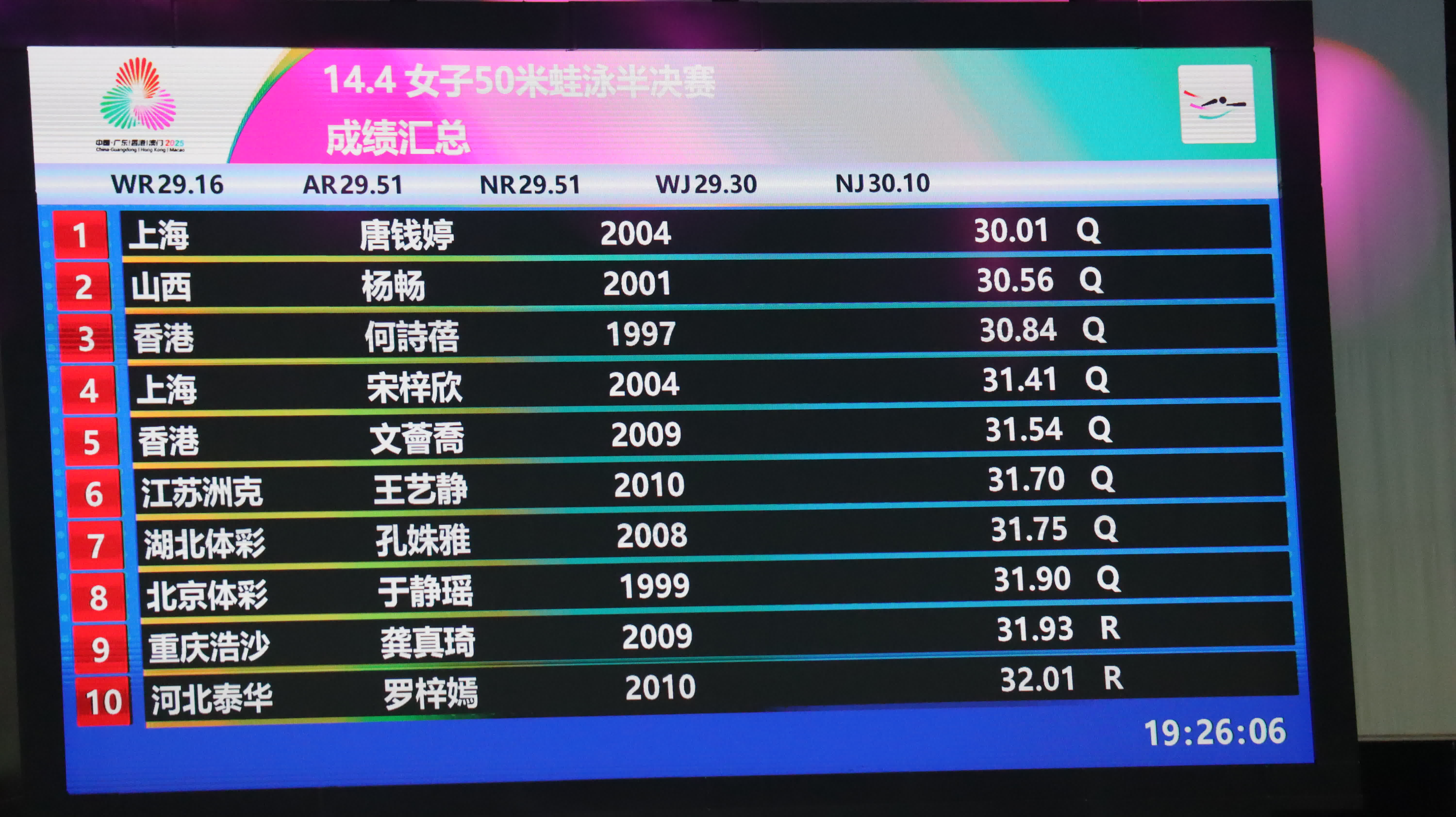 (香港文匯網記者 夏方芳)在第十五屆全運會女子50米蛙泳半決賽中,亞洲紀錄保持者、上海名將唐錢婷以30.01秒的絕對優勢排名第一,展現出衝擊金牌的強勁實力。香港「女飛魚」何詩蓓以30.84秒位列總成績第三,順利晉級;另一位香港選手文薈喬以31.54秒排名第五,同樣獲得決賽席位。
