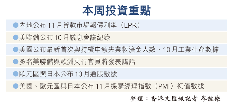 此外,本周全球不同地區有多項重要經濟數據與消息公布,或會左右投資市場表現(見表),包括:內地公布11月貸款市場報價利率(LPR)、美聯儲公布10月議息會議紀錄及歐元區與日本公布10月通脹數據等。