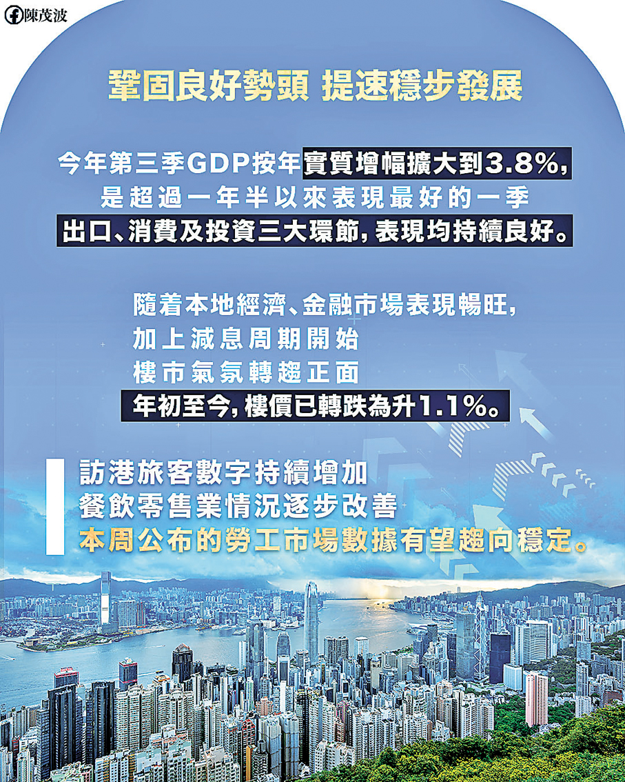 香港今年第三季的本地生產總值按年實質增幅擴大至3.8%,並連續十一個季度錄得按年增長,香港特區政府日前向上修訂對今年全年經濟增長預測至3.2%,將是疫情後連續第三年保持增長勢頭。香港特區政府財政司司長陳茂波昨日發表網誌及接受電台訪問時指出,隨着多個經濟環節表現向好、訪港旅客數字上升,預期明日(18日)公布的勞工市場相關數據有望趨向穩定,甚至回落。