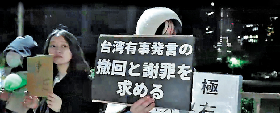 也有抗議者表示,歷史上日本曾以所謂「存亡危機」為借口 ,對中國發動侵略戰爭,「日本,特別是日本首相,不能忘記學習歷史。日本政府和民間長年積累下來的中日互信和友好關係,不到一個月就被首相高市破壞,她沒有當首相的資格。高市須撤回『台灣有事』的言論並致歉 ,辭去首相職務。」