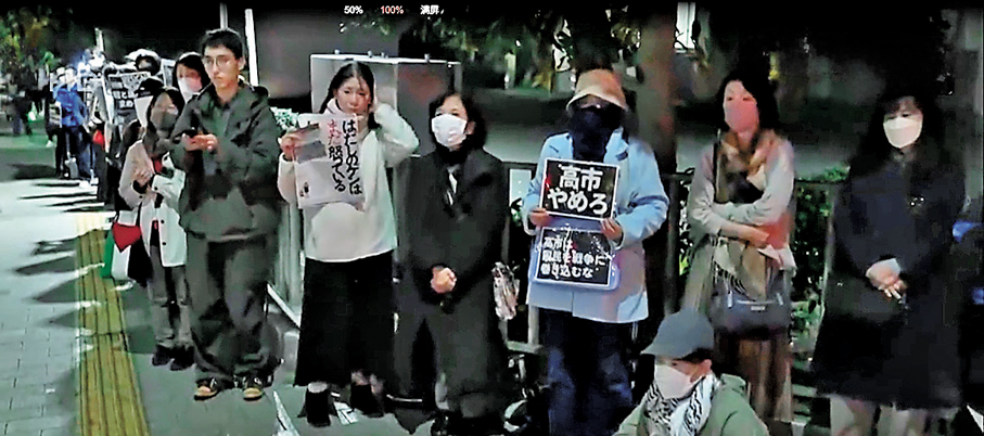 香港文匯報訊 超過100名日本普通民眾15日聚集在東京的首相官邸前發起集會,抗議首相高市早苗近日在日本國會答辯時,發出的涉台錯誤言論,對其錯誤言行表達強烈不滿。多名抗議者手持標語,高呼「高市下台」「不懂外交的人沒有資格當首相」等口號,要求高市辭職。