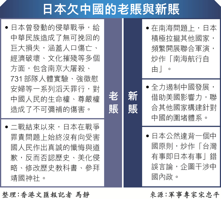 軍事專家宋忠平對香港文匯報表示,針對高市早苗的錯誤言論,解放軍連續兩天刊文,這是對高市早苗的直接回應,經解放軍官方媒體發出,警告和震懾意味更加強硬。一方面正告日本不要低估中國捍衛國家主權和領土完整的堅定決心,另一方面也表明中方有足夠的能力應對任何外部干涉。日本若執意攪局台海,終將自食惡果,「日本欠中國的老賬新賬,我們將一起算」。
