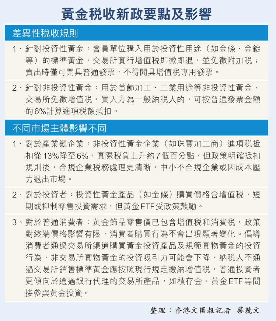 從事黃金飾品和金條等銷售的鼎禎黃金商舖負責人方先生表示:「受新政的影響,非投資性黃金的進項稅抵扣率從13%驟降至6%,直接推高了黃金珠寶商、零售商的採購成本,所以只得轉嫁給顧客。如今顧客購買黃金飾品或者金條都要加7%稅負,一條20克項鏈的成本加上加工費,價值要2萬元(人民幣,下同),再加上7個點的稅,消費者要多支付1,400元,購買成本陡然上升。金條也同樣情況。因此,現在很多消費者都在觀望。」