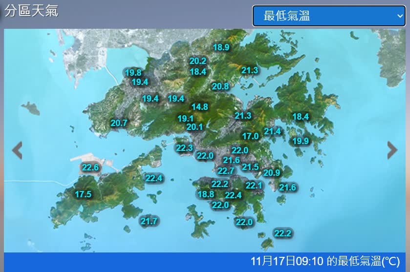 展望本港天氣,明日18日(星期二)多雲,有一兩陣微雨,天氣顯著轉涼,風勢頗大,氣溫介乎15至22度。19日(星期三)天氣多雲,天氣清涼,日間非常乾燥,市區氣溫下降至14度左右,新界部分地區寒冷。本周後期天色逐漸好轉,日間非常乾燥,氣溫逐步回升,但早上仍然清涼。