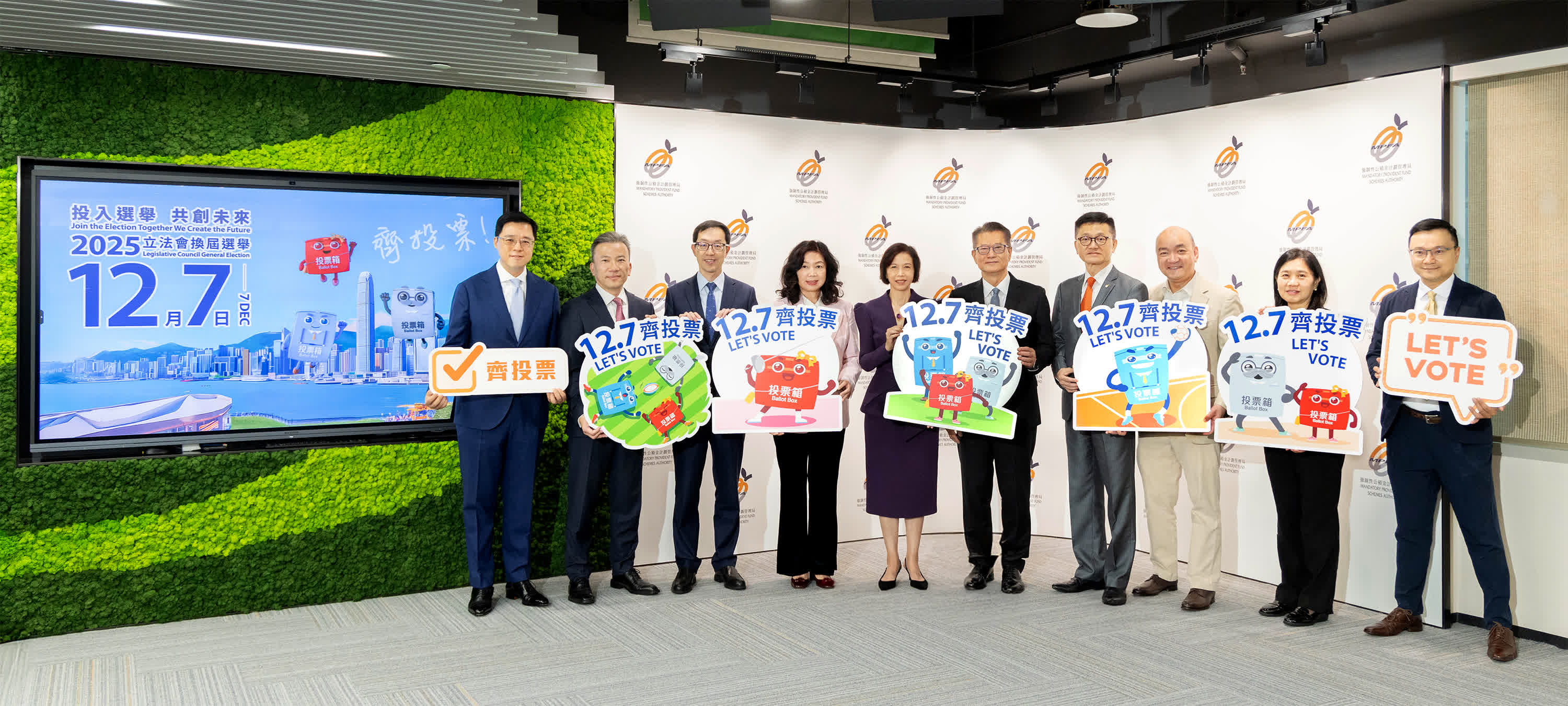 香港文匯報訊 2025年立法會換屆選舉將於12月7日舉行,財政司司長陳茂波、積金局主席劉麥嘉軒、財經事務及庫務局常任秘書長(財經事務)甄美薇、積金局行政總監鄭恩賜、一眾董事局成員及積金局管理層今日(17日)一同宣傳,呼籲強積金業界踴躍投票,履行公民責任,選出代表市民聲音的立法會議員。