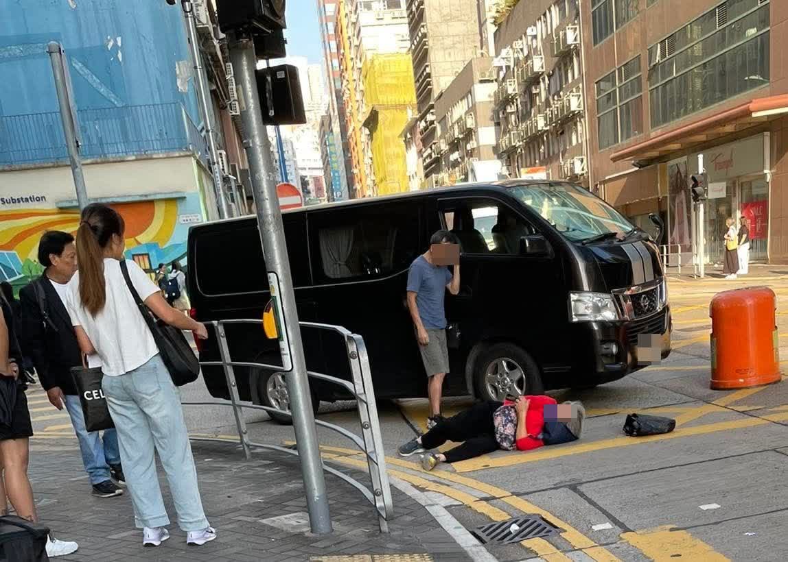 現場圖片顯示,捱撞老婦倒地神情痛楚,客貨車司機及途人則查看老婦傷勢。
