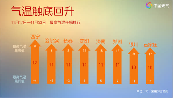 不過,此次寒潮中北方降溫雖來得快、降得猛,但氣溫處於低谷的時間並不長,升溫也會很快。明天開始,北方氣溫就將觸底反彈,大部地區都將加入升溫的行列。其中明天,華北和甘肅、內蒙古等地部分地區升溫幅度可達4℃至10℃;後天,華北、東北和陝西等地部分地區將升溫4℃至8℃。