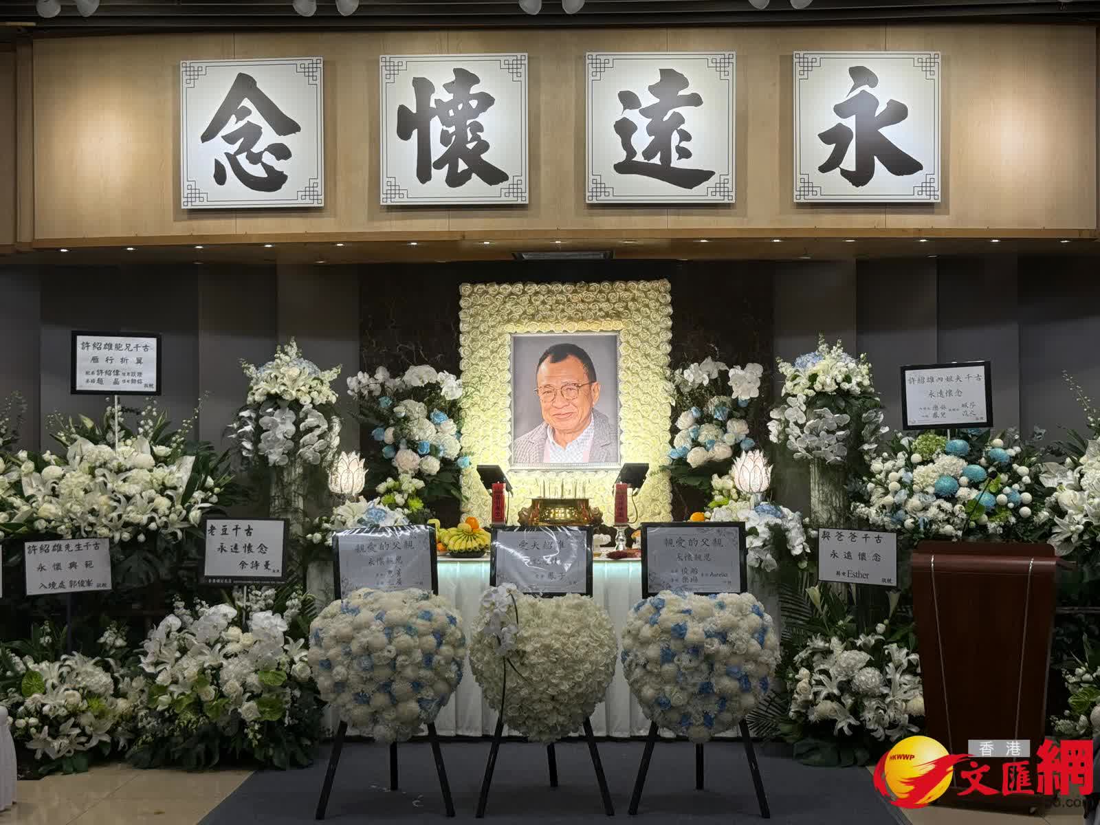 靈堂布置簡約,正中放上一張許紹雄身穿西裝、笑容滿面的遺照,橫匾寫上「永遠懷念」,掛在左邊祭文布上則寫上「父親大人冥鐾 昊靝罔極 孝女惠菁 男俊貽泣血」,而靈前放了太太及子女的花圈,旁邊也放了許紹雄契女佘詩曼送上的「老豆千古 永遠懷念」花圈。靈堂內的電視播着許紹雄生前的影視作品以及領獎片段。