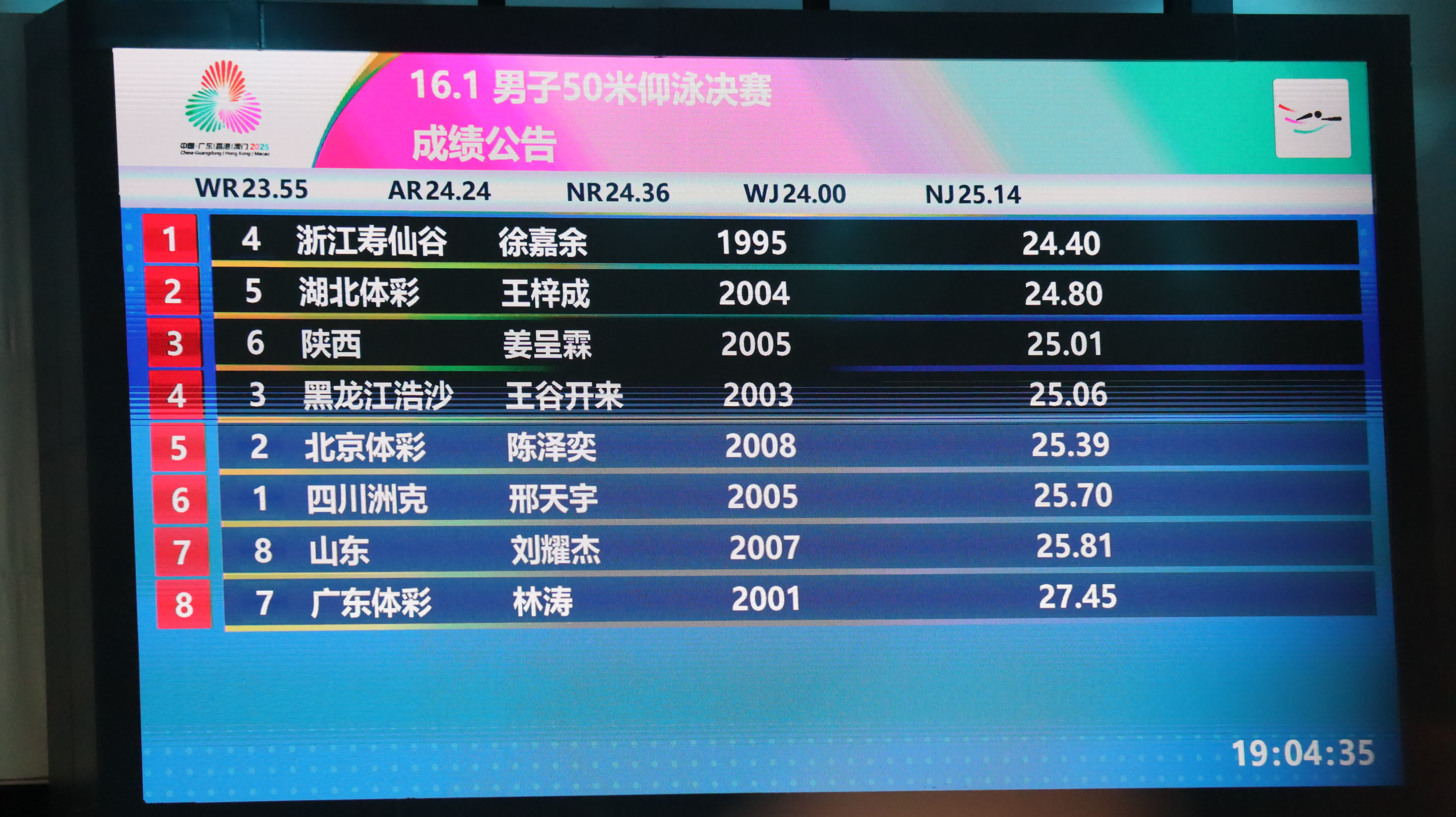 為對標2028年洛杉磯奧運會設項,這是男子50米仰泳第一次進入全運會大家庭。不過,對於徐嘉余而言遊男子50米仰並不陌生。從2012年初登全國賽場,到馳騁世錦賽,歷經大賽考驗,徐嘉余還是2018年雅加達、2022年杭州亞運會該項目的雙料冠軍。
