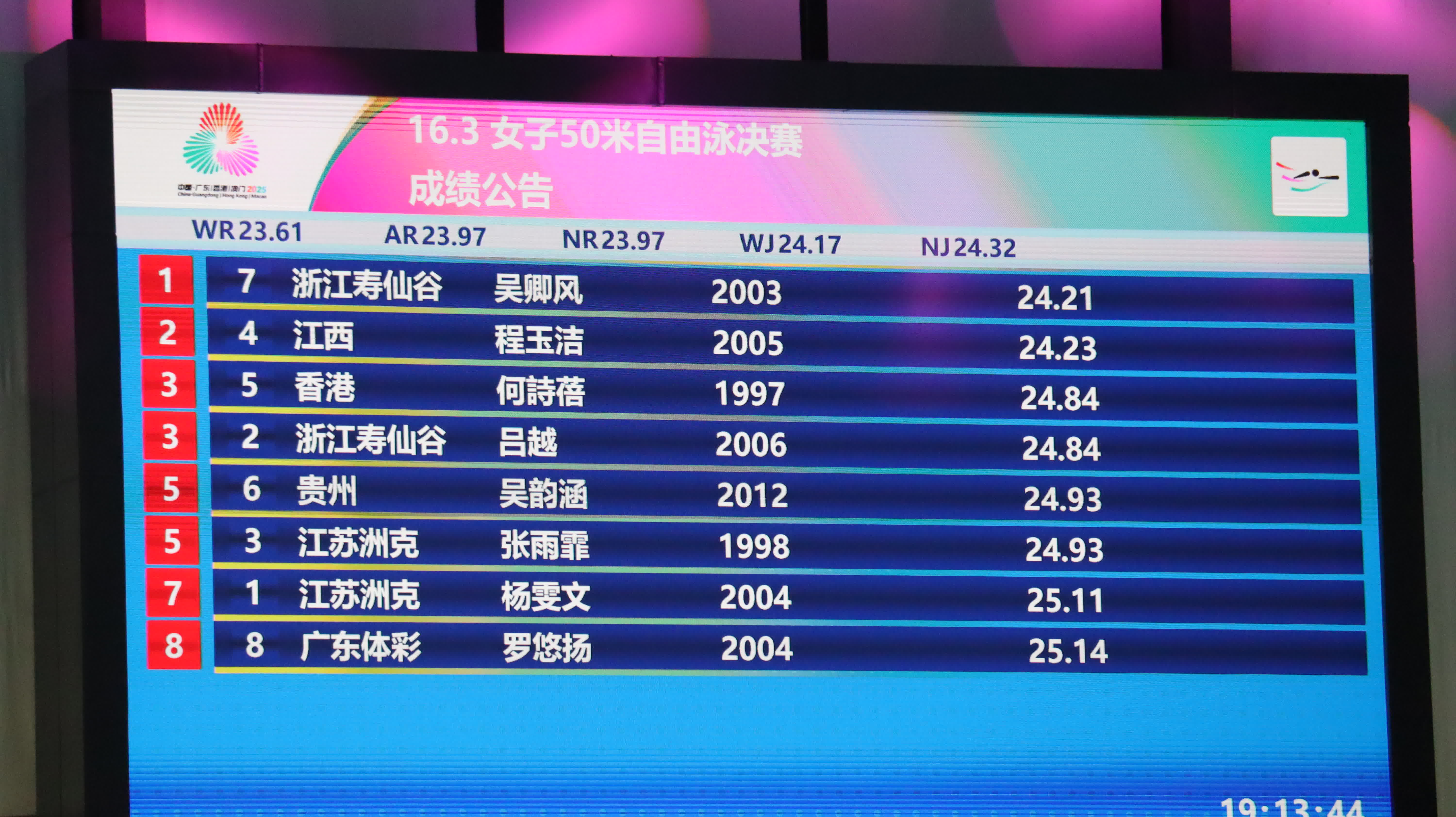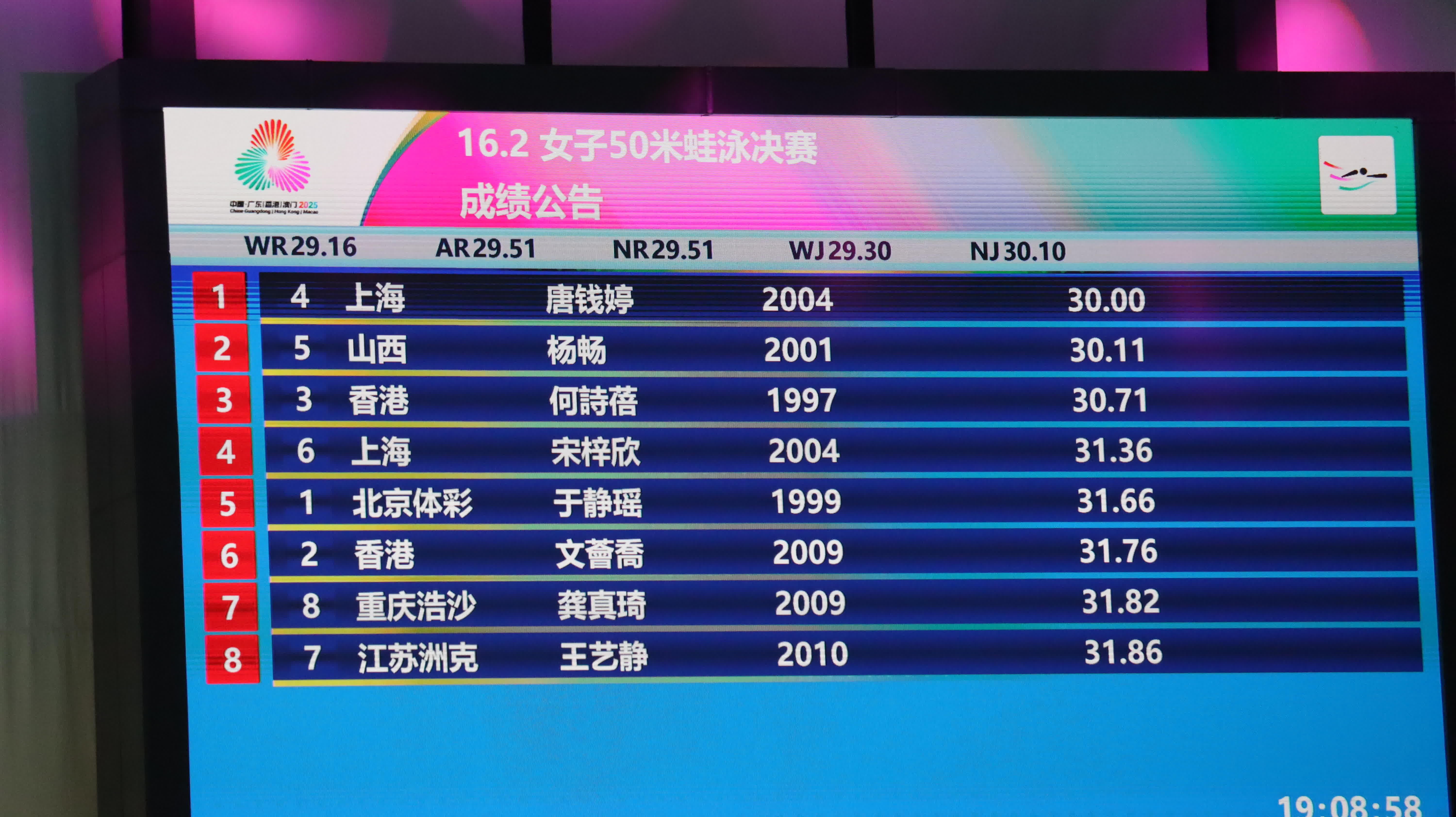 (香港文匯網記者 石華、李望賢)17日晚,在全運會50米蛙泳決賽中,香港選手何詩蓓和文薈喬攜手出戰,最終何詩蓓以30秒71的成績拿到一枚銅牌,文薈喬以31秒76的成績拿到第六名。在緊接着的50米自由泳中,何詩蓓以24秒84再斬獲一枚銅牌。