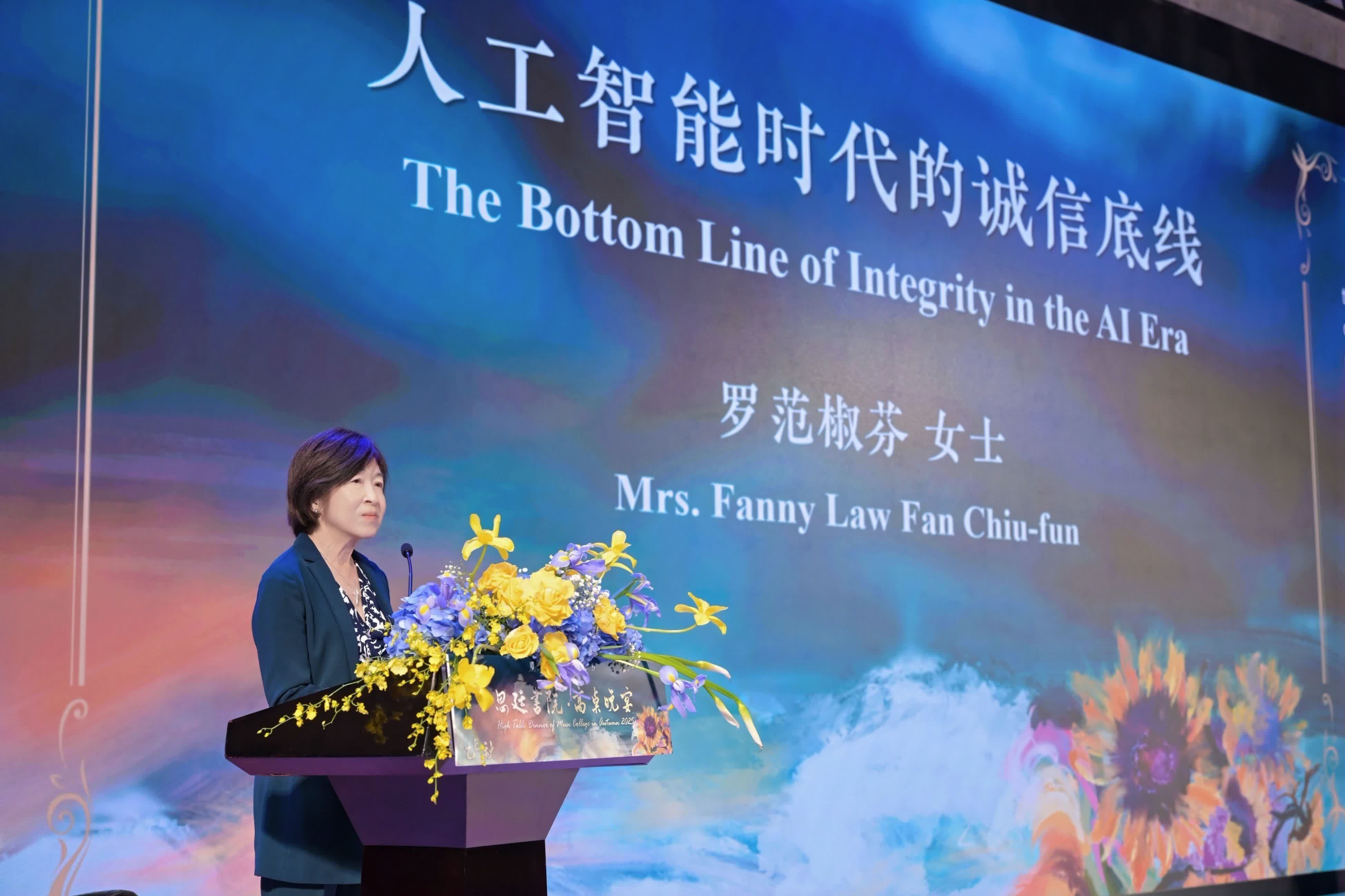在探討人工智能帶來的倫理挑戰時,羅范椒芬指出:「智慧不等於良知」。她強調,AI技術在推動社會進步的同時,也模糊了責任邊界,催生了新型詐騙與技術濫用風險。誠信正成為人類與科技和諧共存的倫理基石。她呼籲青年學子作為「AI時代的原住民」,應秉持「自律的智慧」,在技術應用中堅守誠信底線,「不讓便利取代真實,而用理性駕馭科技」。
