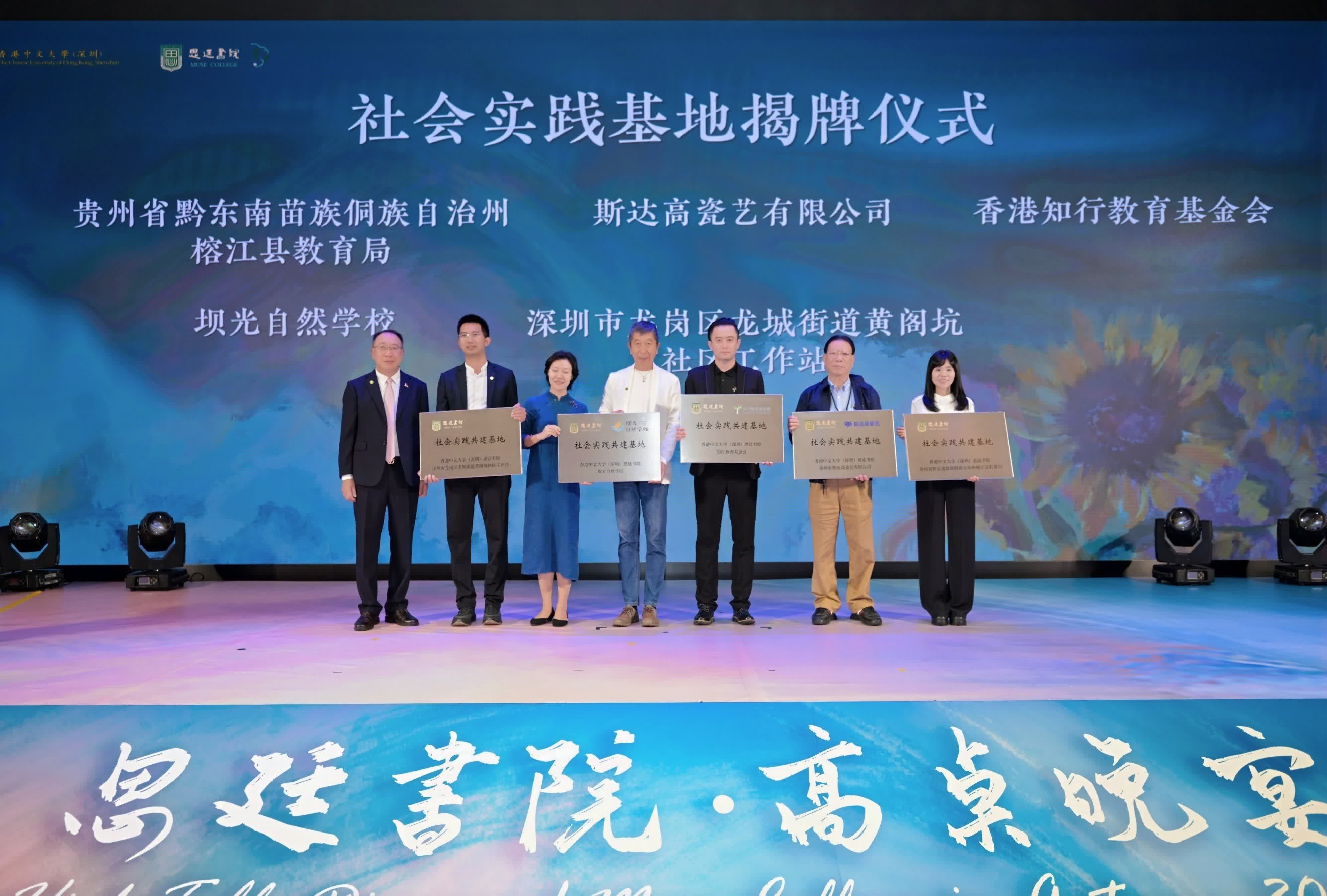 晚宴期間舉行了「大學生社會實踐基地」揭牌儀式,香港中文大學(深圳)思廷書院院長陳永勤代表書院向各合作單位授予「社會實踐共建基地」牌匾。這一合作標誌着書院在拓展育人平台、深化產教融合方面邁出關鍵一步,將為學子提供更豐富的實踐機會與成長通道。