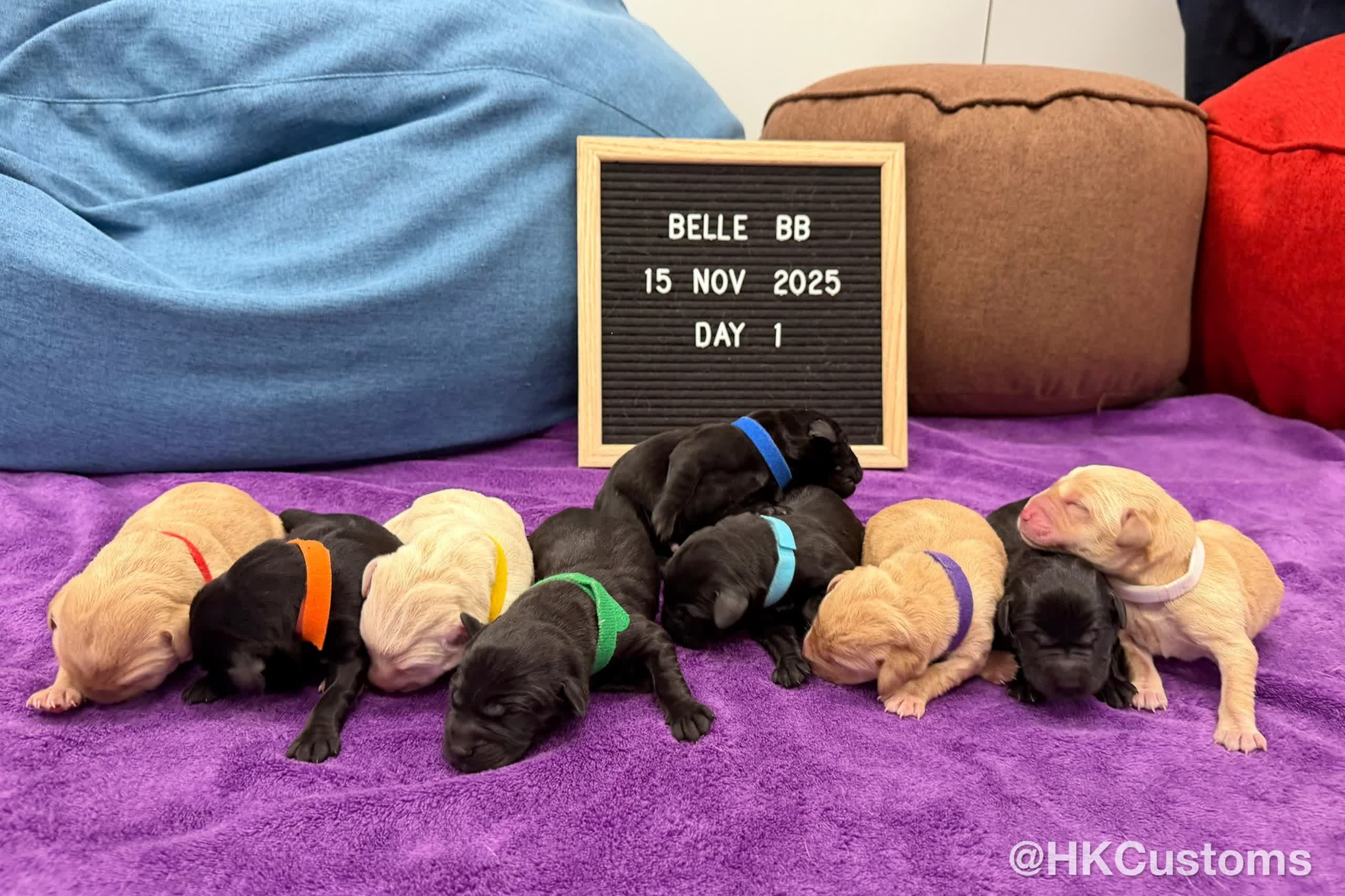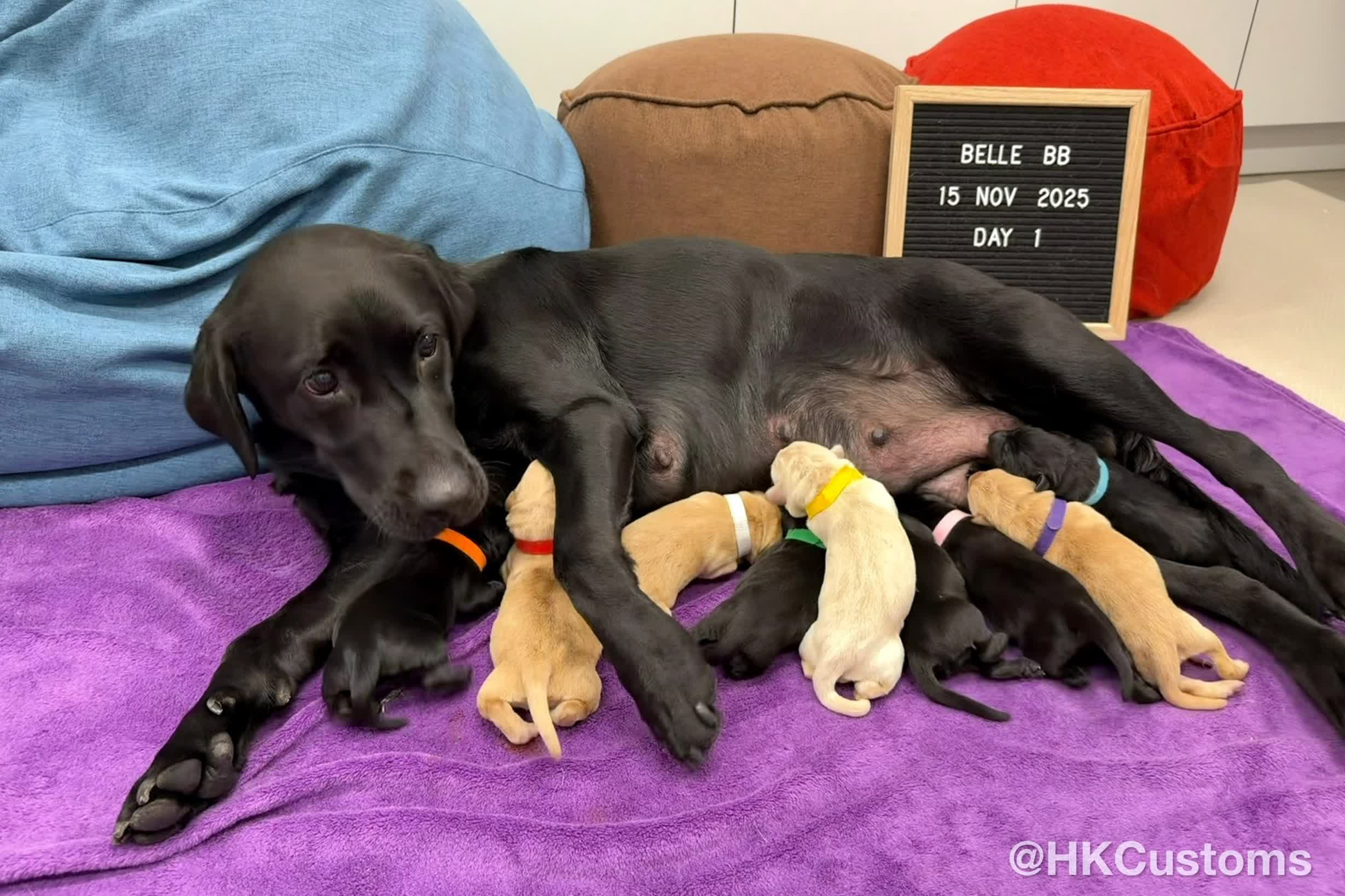 海關指,白色的狗爸爸Denzel是毒品搜查犬,而黑色的狗媽媽Belle是鈔票搜查犬,牠們分別破獲無數大案,表現優秀。今次亦是牠們首次升任爸爸媽媽,表現興奮。現時9隻拉布拉多尋回犬BB由海關人員細心照顧,期待牠們快高長大成為父母一樣出色的搜查犬。