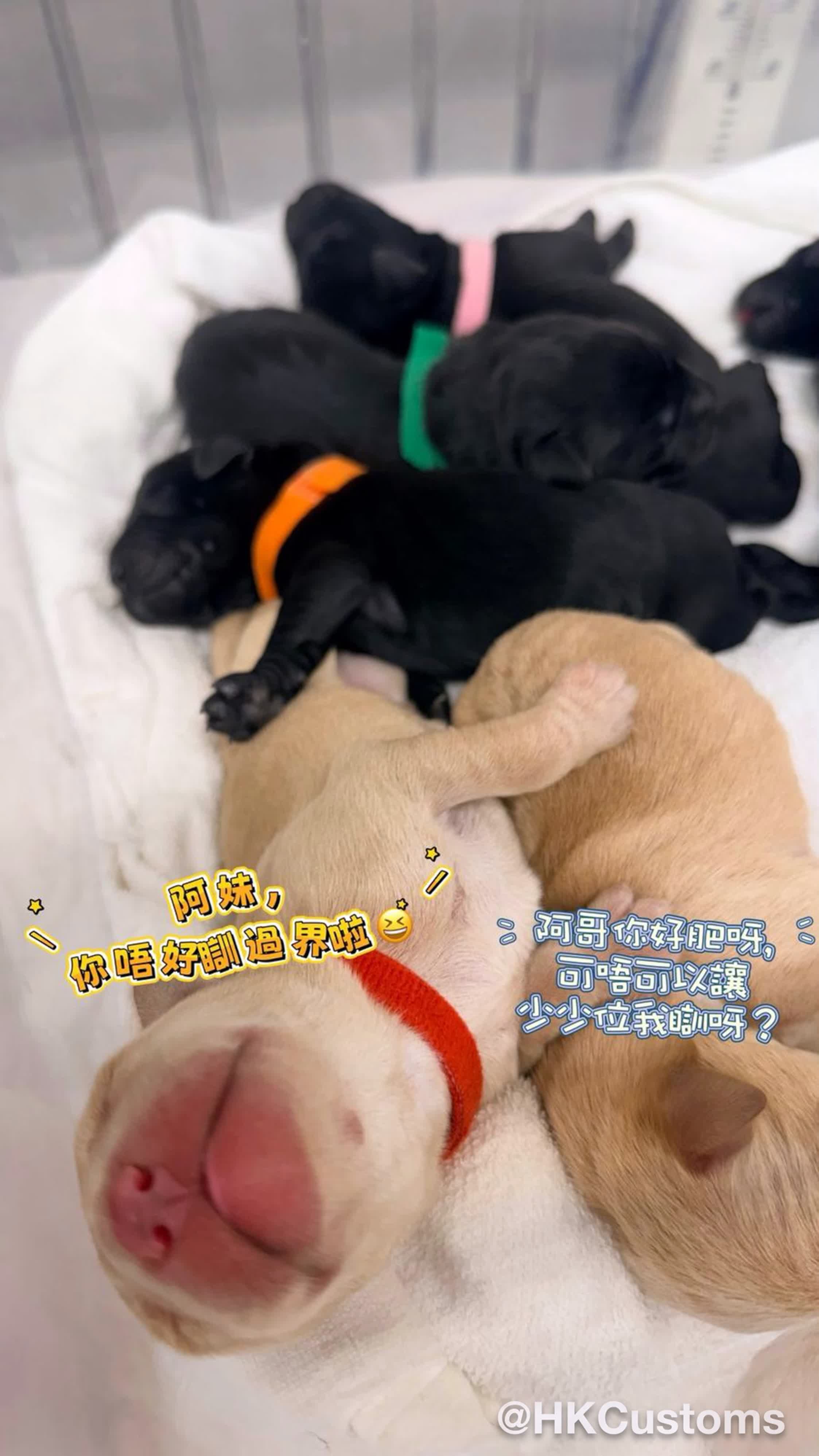 香港文匯報訊(記者 蕭景源)9隻由香港海關自家繁殖的拉布拉多尋回犬BB,剛在前日(15號)成功順產出世。今次亦是海關搜查犬繁殖計劃第一次的拉布拉多黑白配對,故此出世的搜查犬BB有黑色又有白色。