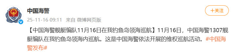據參考消息網援引共同社11月17日報道,16日上午10點15分左右起,4艘中國海警船隻相繼駛入釣魚島周邊海域,上午11點45分前後陸續駛出。日本內閣官房長官木原稔在17日的記者會上就此表示:「已通過外交渠道嚴正抗議。」