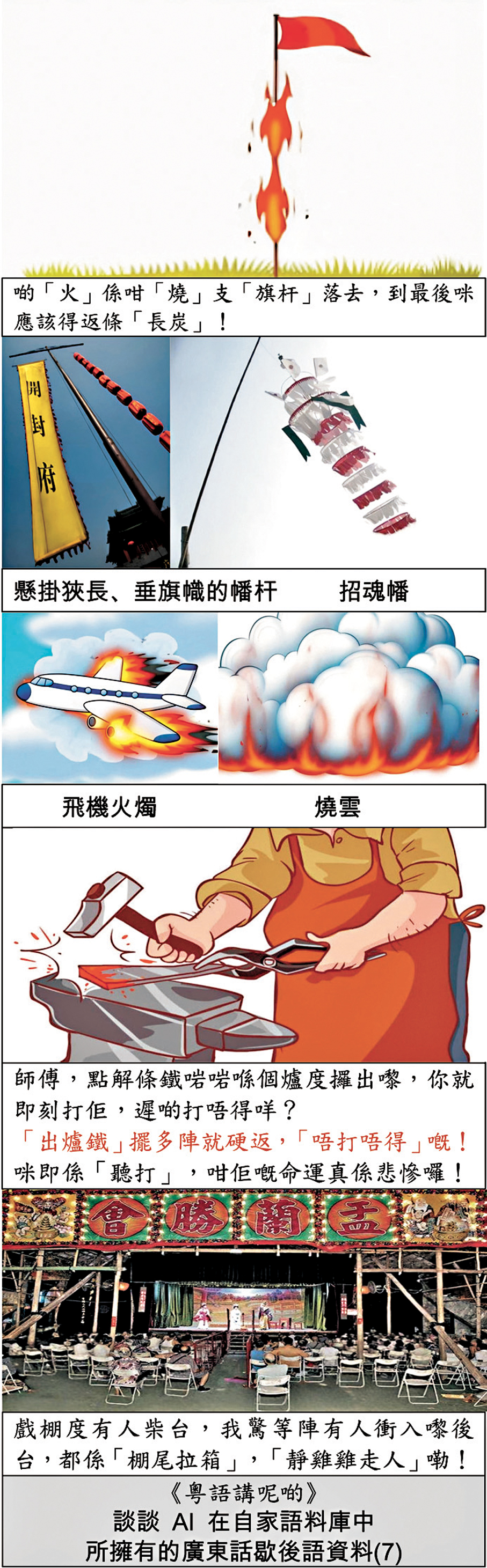 旗杆是一支長木杆,用火燒它會變成炭,到最後就剩下一支「長炭」;炭音諧嘆;「嘆」在廣東話中指「嘆世界(享受人生)」。廣東人來個代換,就得出以下一個歇後語: