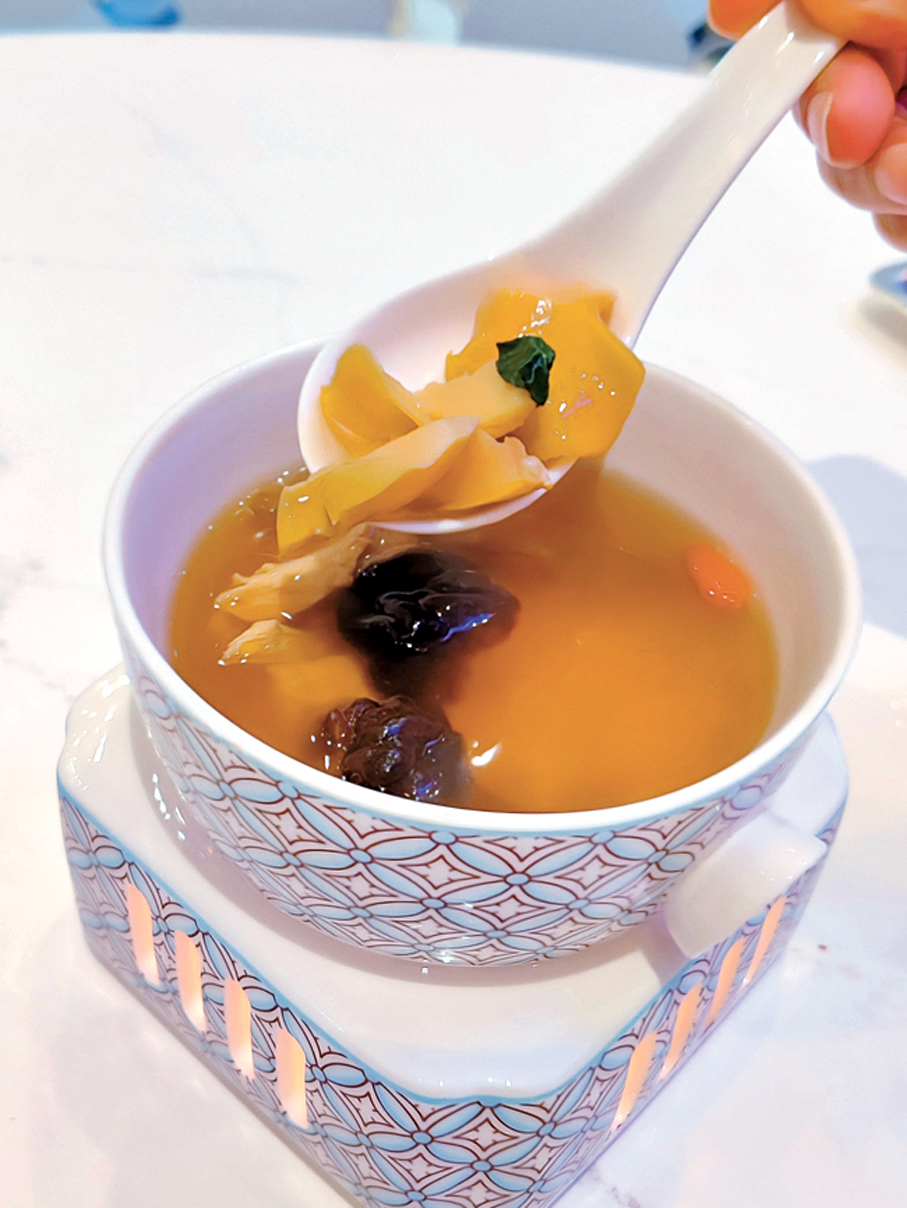 此外,餐廳於晚市時段另設八道菜的嘗味套餐,讓食客一次品嘗由廚師團隊匠心炮製的招牌菜式。菜單包括三款精緻前菜桂花蜜味豚肉叉燒、藤椒醬鮮鮑片及白胡椒葱油海蜇花,以及滋補養顏的石斛核桃菌螺頭燉湯,還有山珍濃雞湯浸蘭度及法國芥末籽黑豚肉鬆炒飯等,並以甜糯軟滑的椰香新疆紅棗糕及清新解膩的果味氣泡茶作結。