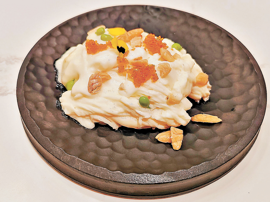 「海皇大良炒鮮奶」則是吳師傅的得意之作。此菜源自順德,烹調技巧繁複,需將蛋白與牛奶倒入熱鑊中快速翻炒,同時精準掌控火候,確保炒鮮奶質感輕盈嫩滑。