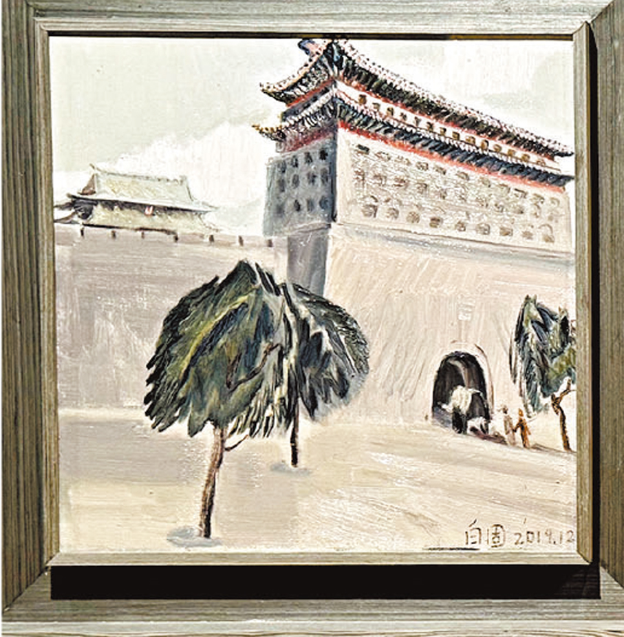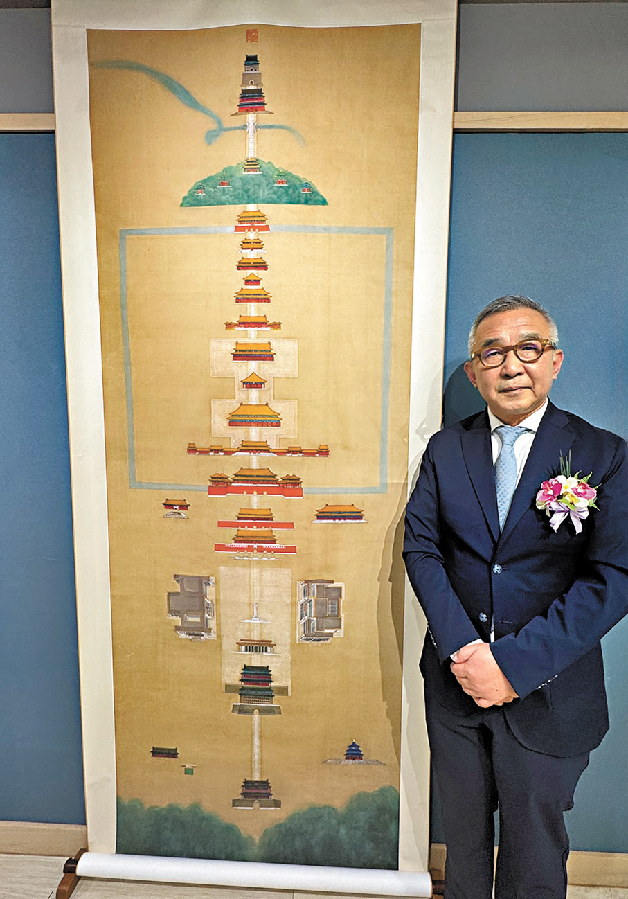他介紹了自己的作品《京城之脊》:「這是我為北京中軸線申遺專門創作的作品。這幅畫展示了北京的中軸線,從最南邊的永定門,一直到北邊的鐘鼓樓,中間經過正陽門、天安門廣場、人民大會堂、國家博物館、故宮、景山等等。其中萬寧橋特別重要,它是中軸線最初的起點。」他又補充道:「中軸線很有意思,比如太廟是祭祀祖先的地方,社稷壇象徵江山社稷,而建國後建的人民大會堂和國家博物館,也延續了『左祖右社』的布局——左邊是國家博物館,對應『祖』;右邊是人民大會堂,對應『社』,這些都是參政議政、關乎江山社稷的地方。」