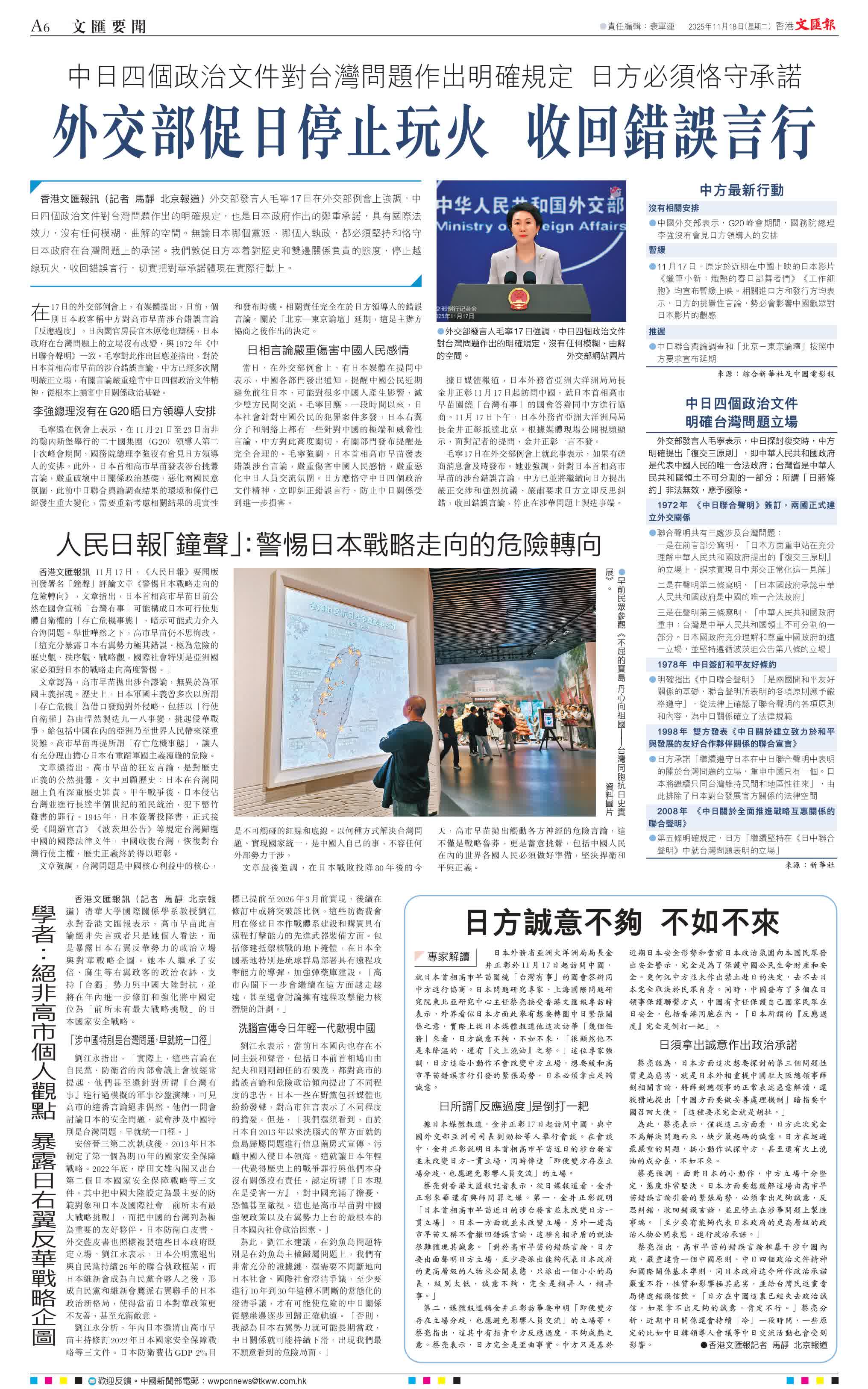 清華大學國際關係學系教授劉江永對香港文匯報表示,高市早苗此言論絕非失言或者只是她個人看法,而是暴露日本右翼反華勢力的政治立場與對華戰略企圖。她本人繼承了安倍、麻生等右翼政客的政治衣缽,支持「台獨」勢力與中國大陸對抗,並將在年內進一步修訂和強化將中國定位為「前所未有最大戰略挑戰」的日本國家安全戰略。