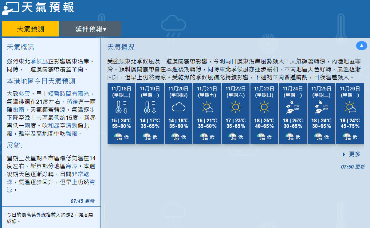天文台表示,受強烈東北季候風影響,今日(11月18日)本港天氣顯著轉涼,星期三及星期四(11月19及20日)市區最低氣溫在14度左右,新界部分地區寒冷。此外,風寒效應會較為明顯,天文台提醒市民留意天氣變化,注意保暖,並多關顧長者及慢性病患者。