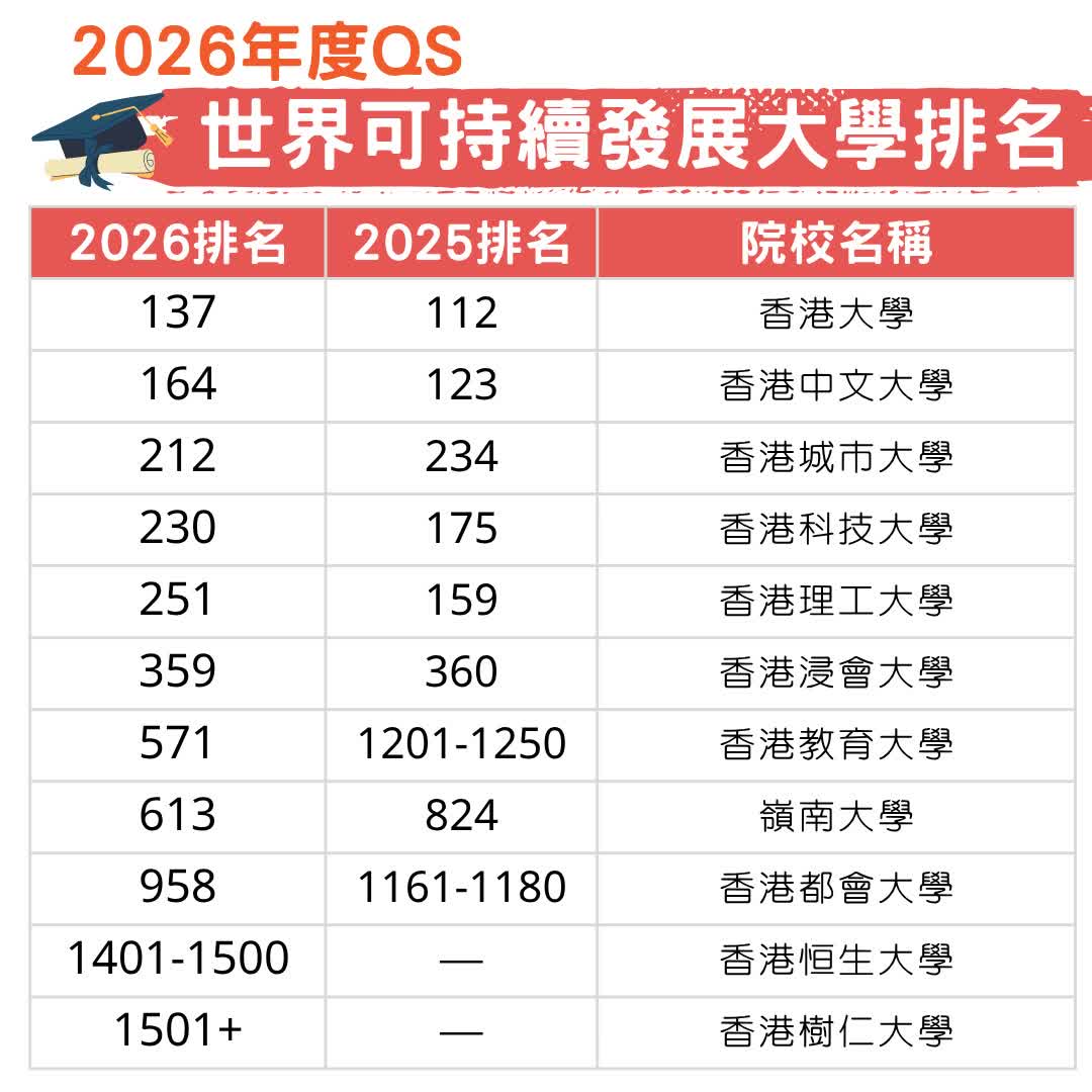 香港文匯報訊(記者 莫楠)國際高等教育排名機構Quacquarelli Symonds(QS)今日(18日)公布最新《世界可持續發展大學排名》。本年度共有來自106個國家及地區、約2,000所大學上榜,數量較去年約1,750所進一步增加。香港共有11所院校入榜,其中5所排名上升,另有2所首次入圍,整體表現穩中有進。香港大學繼續位居本地榜首,位列亞洲第十,在環境研究與知識交流指標方面表現突出,當中「就業與機遇」分項指標更列全球第二;香港教育大學成為全球升幅最大的院校之一,從去年第1,201至1,250位升至第571位。QS指出,上述進步反映本港院校在可持續發展目標(SDG)相關研究、社區參與及課程改革等方面持續推進,配合本地政策議程,推動高等教育可持續發展。